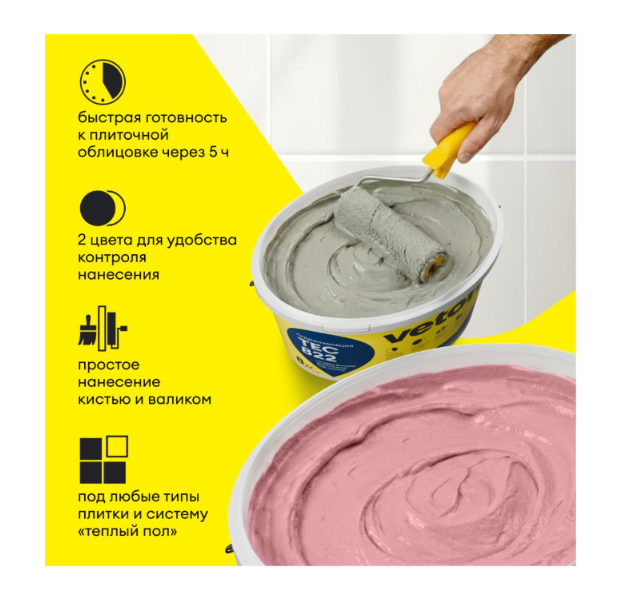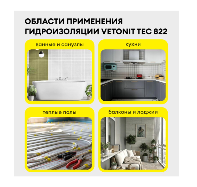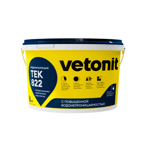 Vetonit tec 822 - высокоэластичная бесшовная полимерная гидроизоляция под плитку для помещений с повышенной влажностью - ванных комнат, душевых, санузлов, кухонь, балконов и лоджий Для защиты от повреждения водой чувствительных к влаге материалов: гипсокартонных листов, гипсоволокнистых листов, гипсовых штукатурок и полов. Подходящие основания: бетонные и цементные полы, цементные и цементноизвестковые штукатурки, старые облицовочные плитки, ОСБ и ДСП, гипсокартонные листы, гипсоволокнистые листы, гипсовые штукатурки и полы.