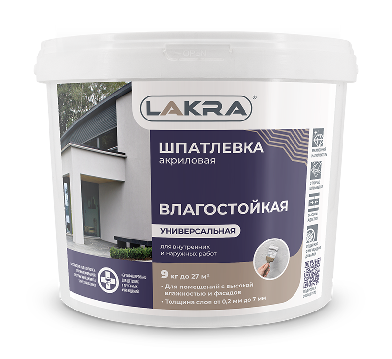 Высококачественная, готовая к применению, шпатлевка на основе водной дисперсии акрилового сополимера, имеет высокую адгезию к основанию, стойкость к растрескиванию и малую усадку. После высыхания отлично шлифуется.