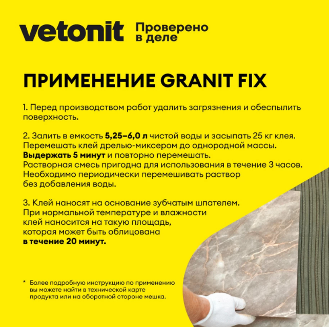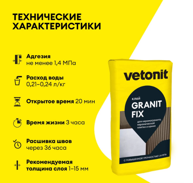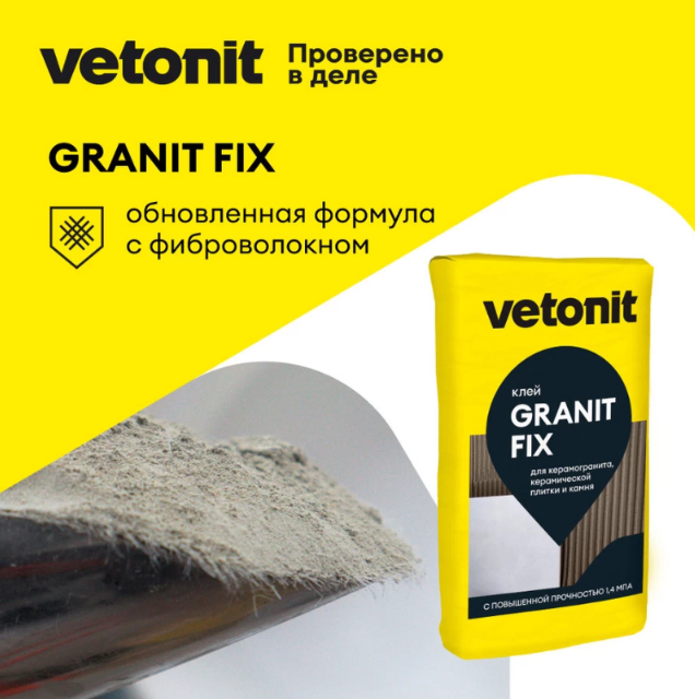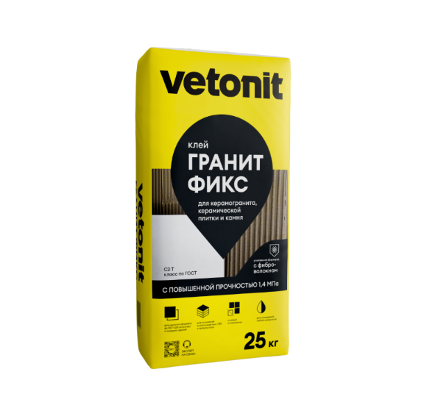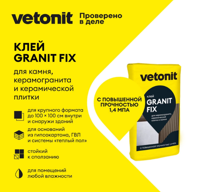 Vetonit гранит фикс - клей класса С2 Т подходит для внутренних и наружных работ, для стен и пола, включая систему «Теплый пол». Рекомендованный формат керамогранита – до 100х100 см. Совместим с гидроизоляцией, надёжен в эксплуатации влажных помещениях, а также на балконах, лоджиях, террасах. Походит также для облицовки натуральным и искусственным камнем.