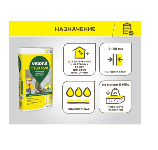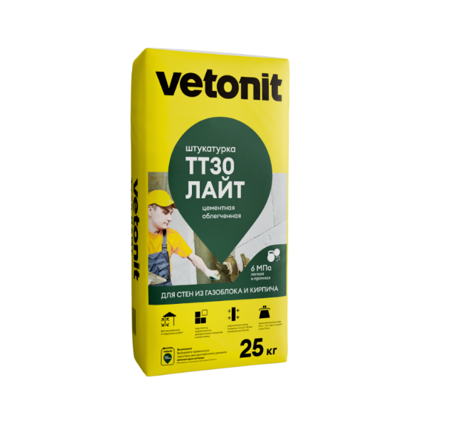 Vetonit TT30 лайт - облегченная цементная штукатурка для базового выравнивания стен и потолков в сухих, влажных и мокрых помещениях перед облицовкой плиткой и природным камнем (в том числе ванных комнат и подвалов), нанесением декоративной штукатурки и финишным шпаклеванием. Выравнивание наружных поверхностей зданий при проведении строительных и ремонтных работ фасадов. Идеальна для газобетона.