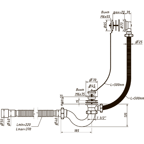 Сифон 1 1/2"х40, с переливом и нержавеющими чашками, для ванн и глубоких душевых поддонов. Конструкция сифона S-образная, прямоточная. В комплекте латунная цепочка с пробкой. Отвод в канализацию гибкая труба 40 – 40/50.