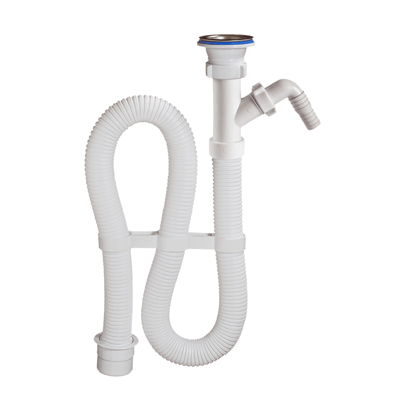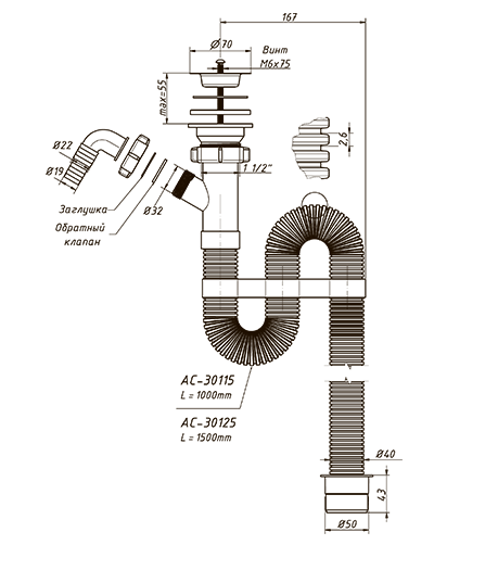 Сифон гофрированный 1 1/2"х40 для раковины и мойки, с нержавеющей чашкой д.70мм, надёжным трёхходовым хомутом и переходником 50 мм в канализацию. Длина гибкой трубы с патрубком 1000мм.