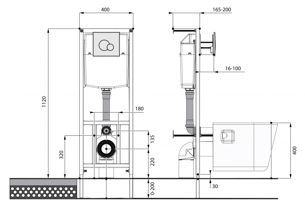 Комплект скрытой системы инсталляции, унитаза с сиденьем и панелью управления для монтажа к несущей стене или в гипсокартонную конструкцию, для пола с толщиной стяжки 0–200 мм, для установки подвесного унитаза с интервалом крепления 180мм. Подключение воды: сверху справа/слева, надежное крепление к стене, доступ к механизмам: легкий и удобный демонтаж панели, наливной механизм: уровень шума не более 50 Дб, бачок: с шумоизоляцией и изоляцией от конденсационной влаги, сливной механизм: надежность клапана 150 000 циклов. Рама: стальной профиль 30х30 с антикоррозийным покрытием. Патрубок: диаметр выпускного патрубка 110 мм, что соответствует российским стандартам. Ножки: легко регулируемая высота 0-200 мм
