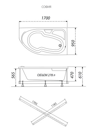 Размер 170Х950. Объем 300 литров. Глубина ванны 475 мм.