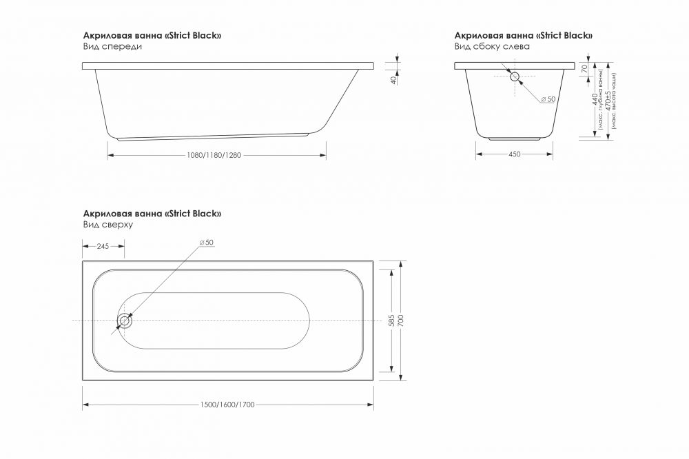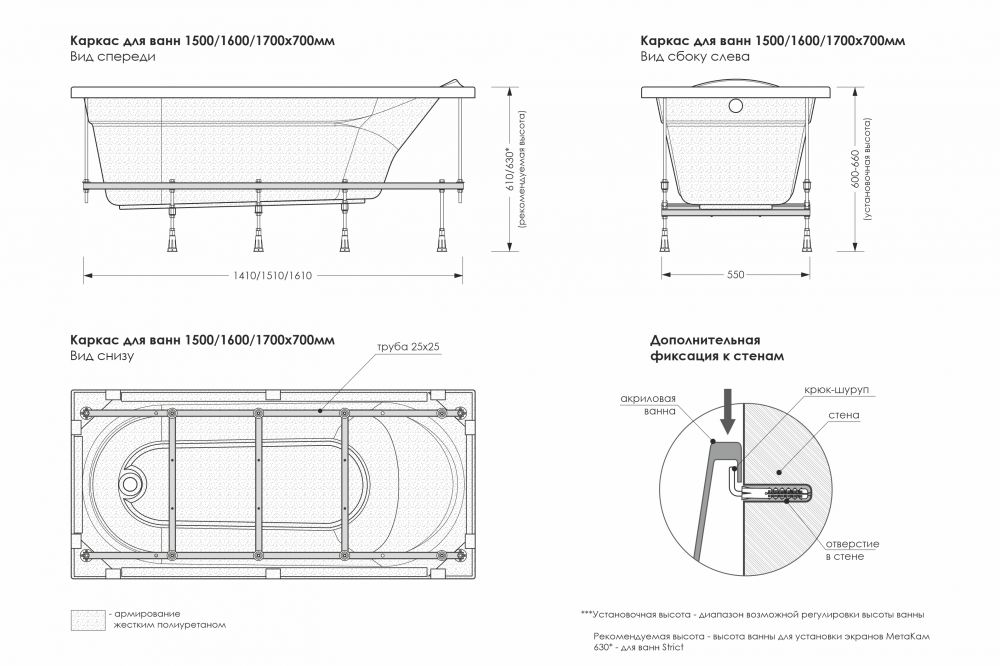 Ванна акриловая МЕТАКАМ "Strict Black" 1500х700 мм (в комплекте с каркасом и экраном ЭВS-015391) 3 ч