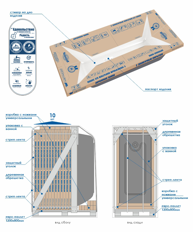 Акриловая ванна «Comfort Maxi» имеет собственную упаковку из гофрокартона крафт, которая защищает борта изделия по всему периметру. На дно ванны приклеивается стикер и вкладывается паспорт изделия.