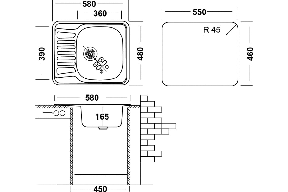 Мойка нержавеющая UKINOX "Комфорт" левая врезная 58х48 см толщина 0,6 мм глубина 16 см (вып 3 1/2)