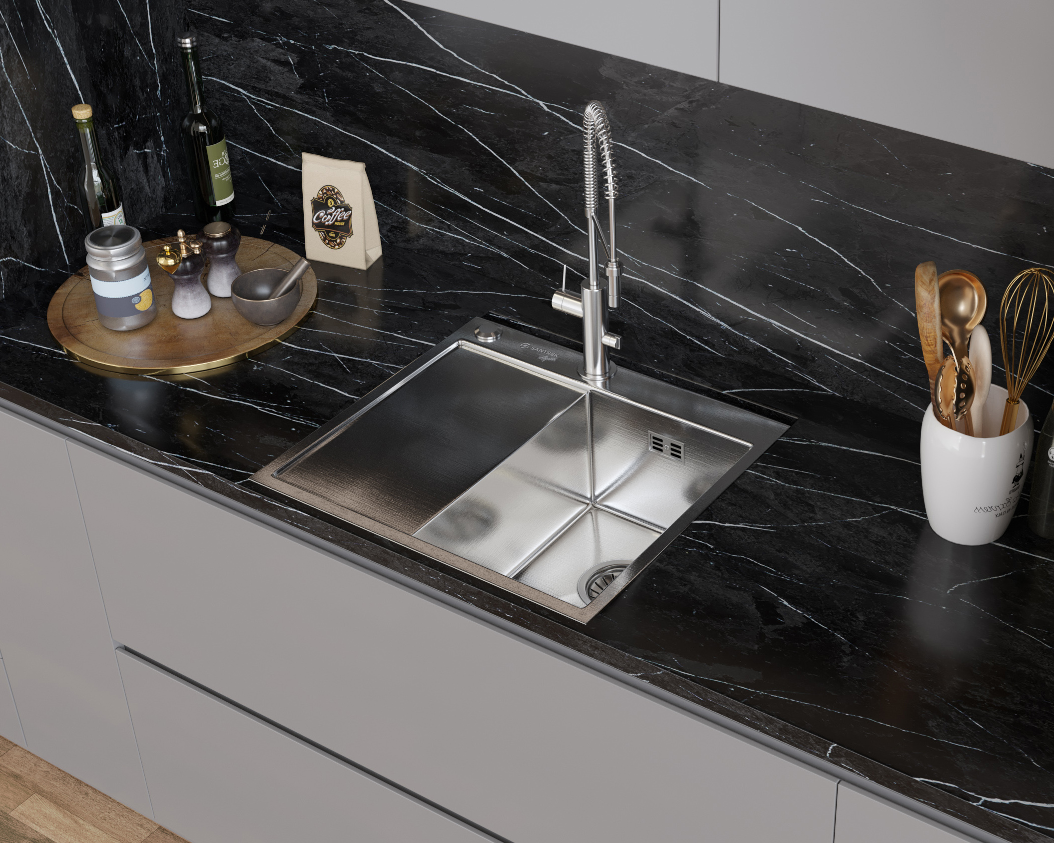 Мойка нержавеющая SANTREK – это надежное и удобное решение для вашей кухни. Эта мойка изготовлена из прочной и долговечной нержавеющей стали, устойчивой к коррозии и высокой температуре. Ее глубина 220 мм позволяет комфортно мыть посуду любого размера, в то время как ее обшие размеры легко вписываются в любую кухонную мебель. Дополнительно к мойке поставляется сифон, который предотвращает засорение системы канализации и исключает неприятные запахи. Дозатор для жидкости помогает экономить моющее средство, а коландер идеально подходит для овощей, фруктов и мяса. Хотелось бы отметить преимущества нержавеющей мойки SANTREK . Стойкость к коррозии: нержавеющая мойка не подвержена ржавчине и другим видам коррозии, что делает ее идеальным выбором для использования во влажных условиях.