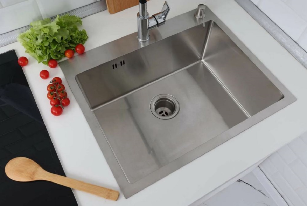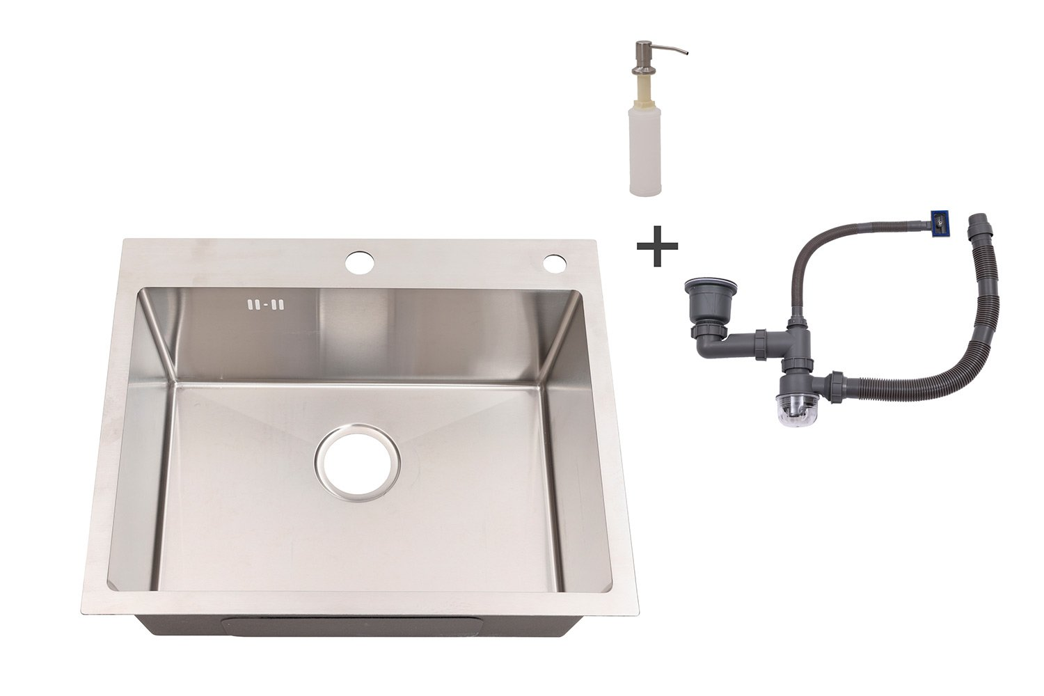 мойка врезная из нержавеющей стали SUS 304 с шумоизоляцией, без покрытия матовая "Декор", толщина борта 3 мм, толщина чаши 0,6 мм, диаметр слива 110 мм, глубина чаши 220 мм, ширина и длина 600х500 мм, есть одно отверствие под смеситель и второе отверствие 28 мм под дозатор или фильтр для питьевой воды