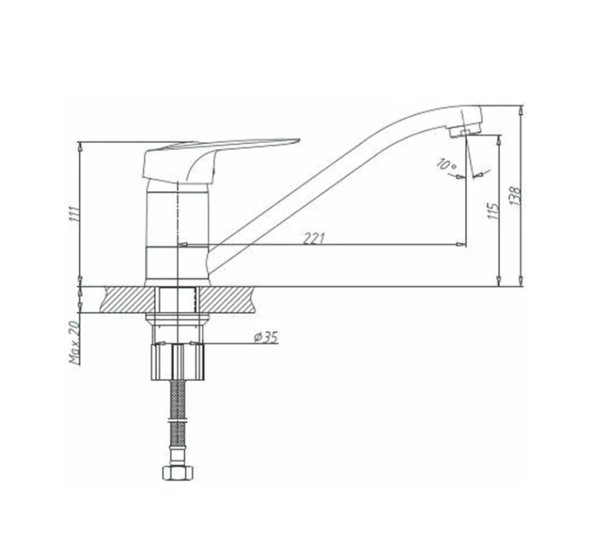 Длина излива подходит для большинства бытовых кухонных моек.