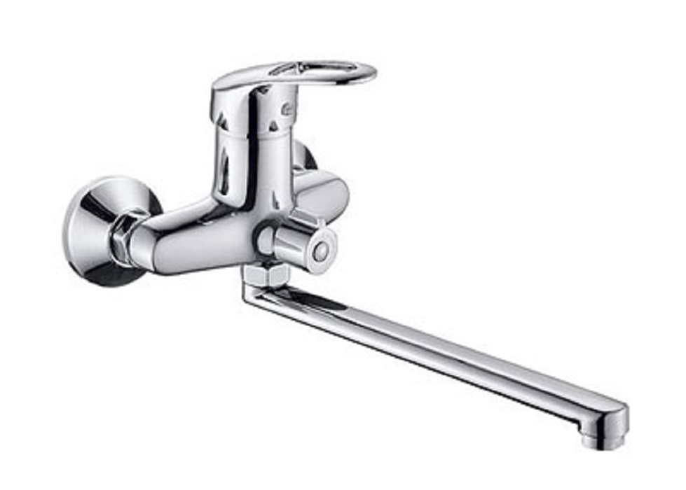 Смеситель для ванны и душа с плоским изливом. В комплекте с шлангом, кронштейном и лейкой.