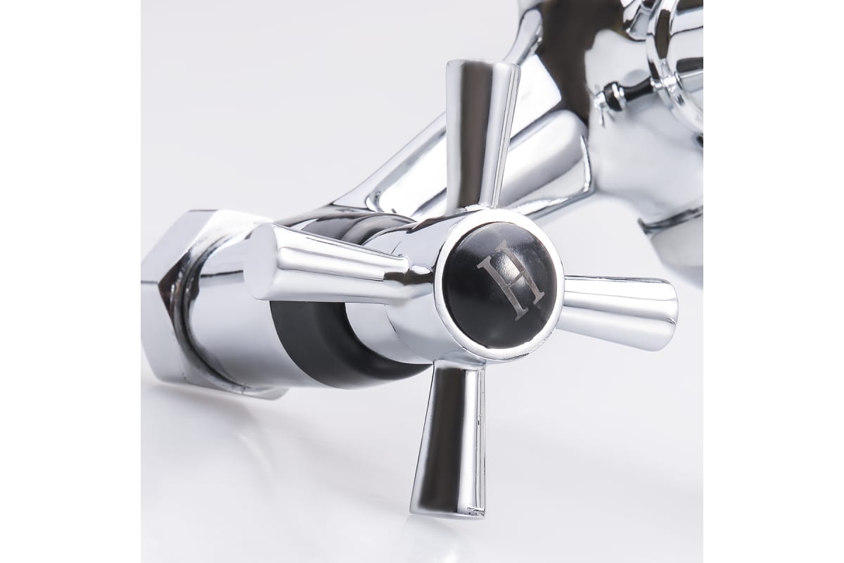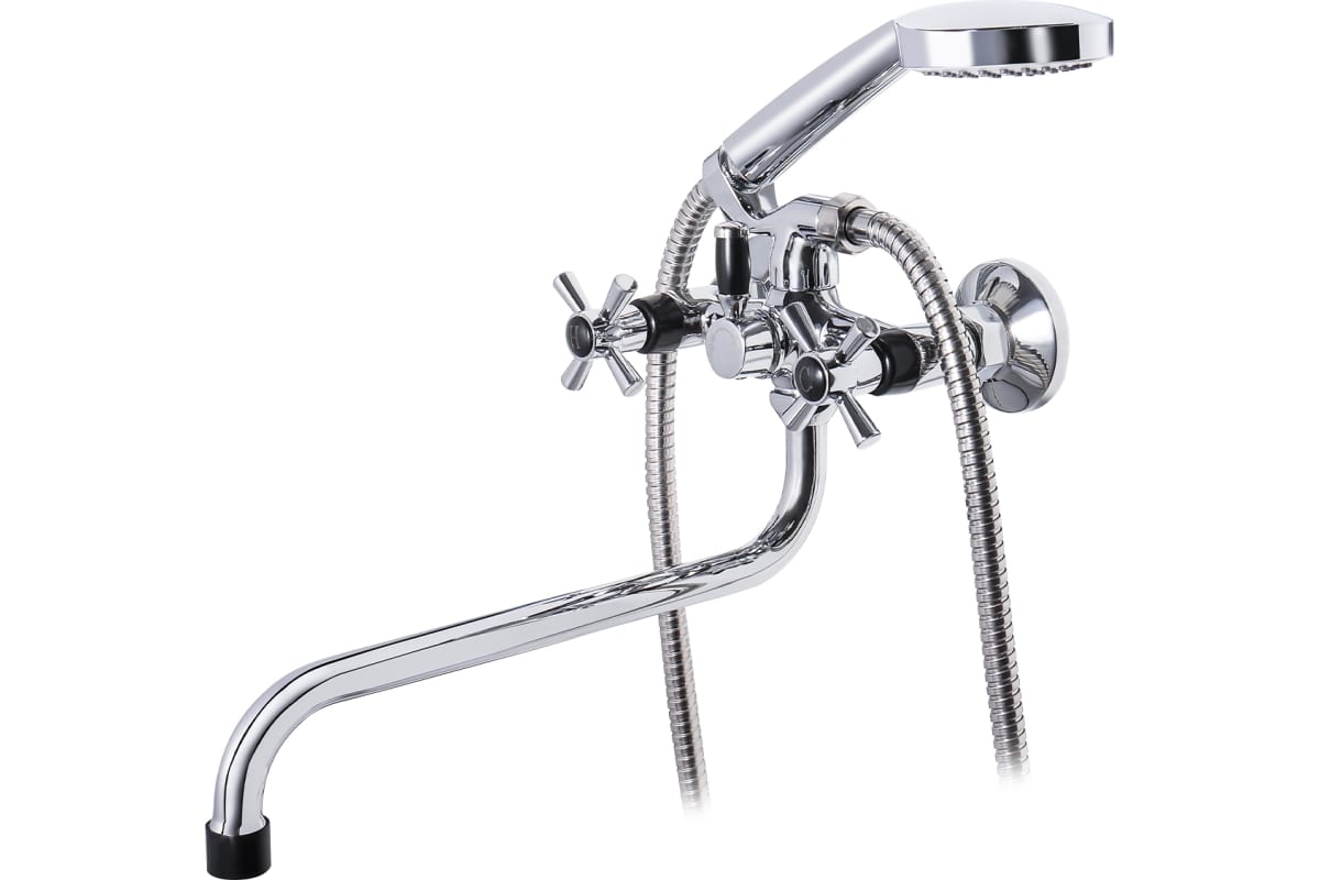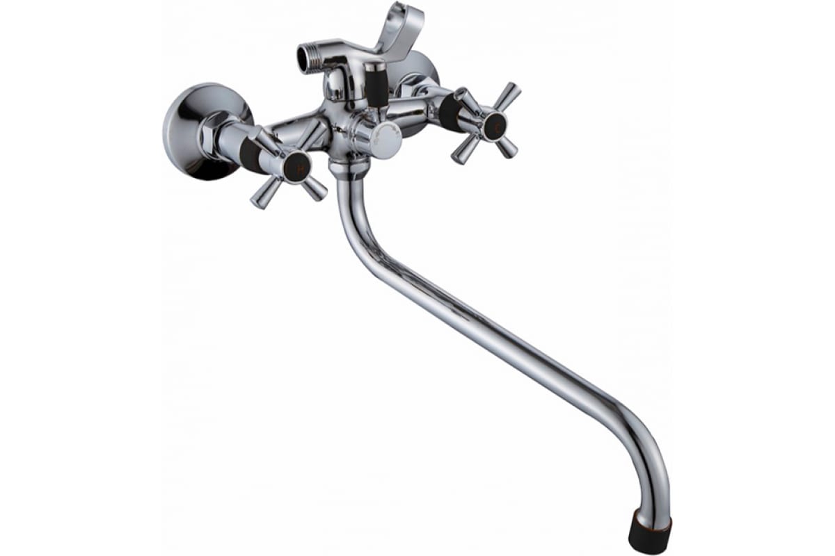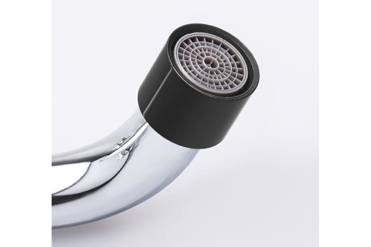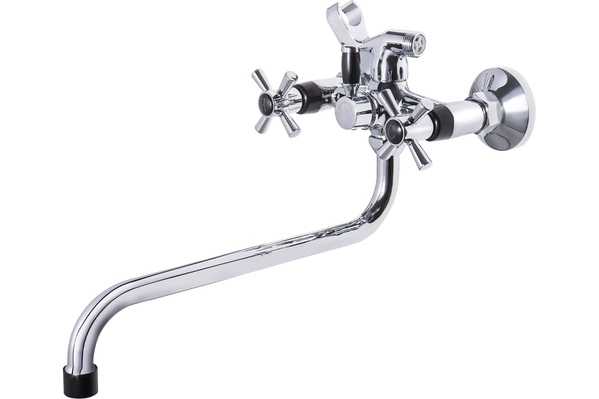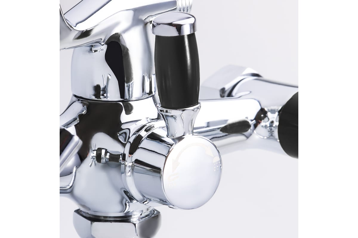 Смеситель с черными вставками на ручках и черным наконечником, оборудован керамической кран-буксой размером 90 мм, которая обеспечивает точную настройку напора воды. Переключатель душ/излив имеет поворотный механизм с фиксацией, что позволяет успешно использовать данную модель в квартирах и домах с пониженным давлением в системе водопровода. Держатель для лейки находится на корпусе смесителя.
