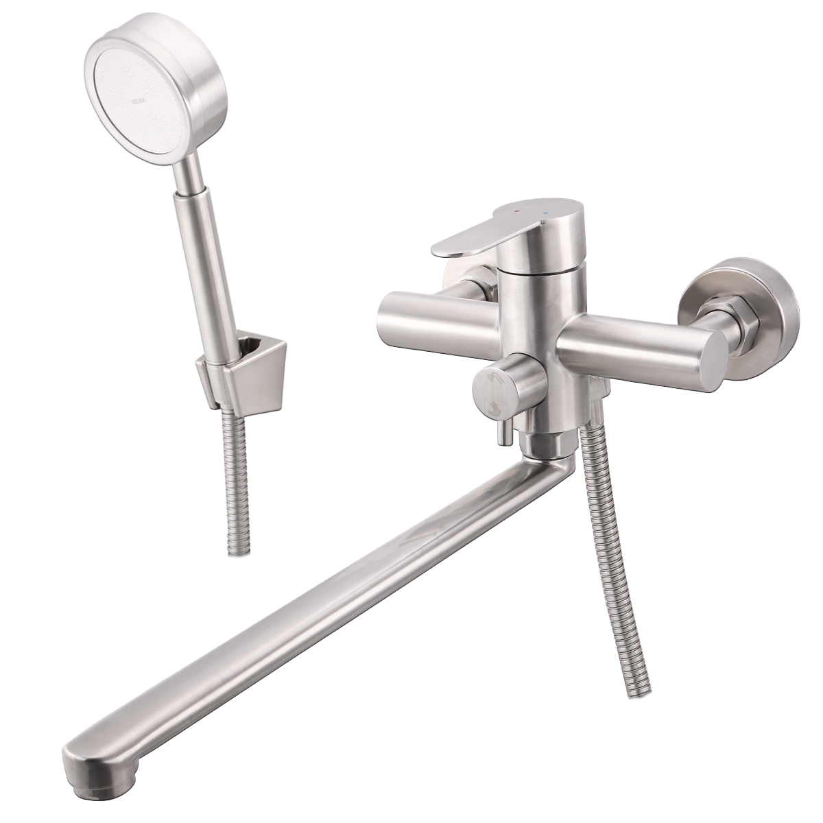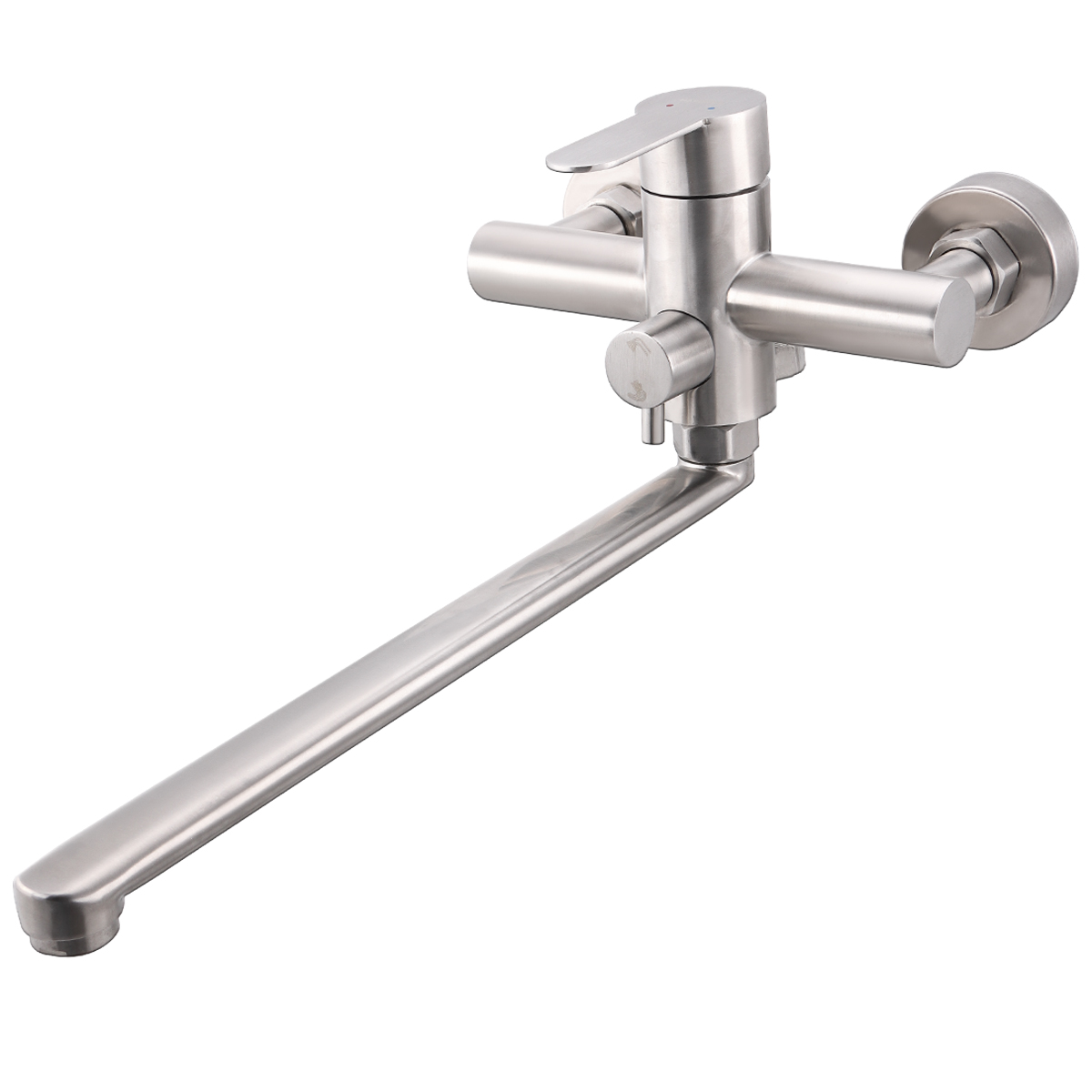 Смеситель для ванны с длинным изливом однорычажный . Смеситель предназначен для вертикального крепления. Изготовлен из нержавеющей стали с покрытием цвета сатин. Переключатель душ/излив, имеет поворотный механизм с фиксацией, что позволяет успешно использовать данную модель в квартирах и домах с пониженным давлением в системе водопровода. Поворотный излив оснащен аэратором. Аэратор существенно понижает уровень шума.Комплектация: длинный металлический шланг 150 см, и 1-режимная лейка, комплект эксцентриков Смеситель данной коллекции подходит для разных интерьеров ванных комнат.