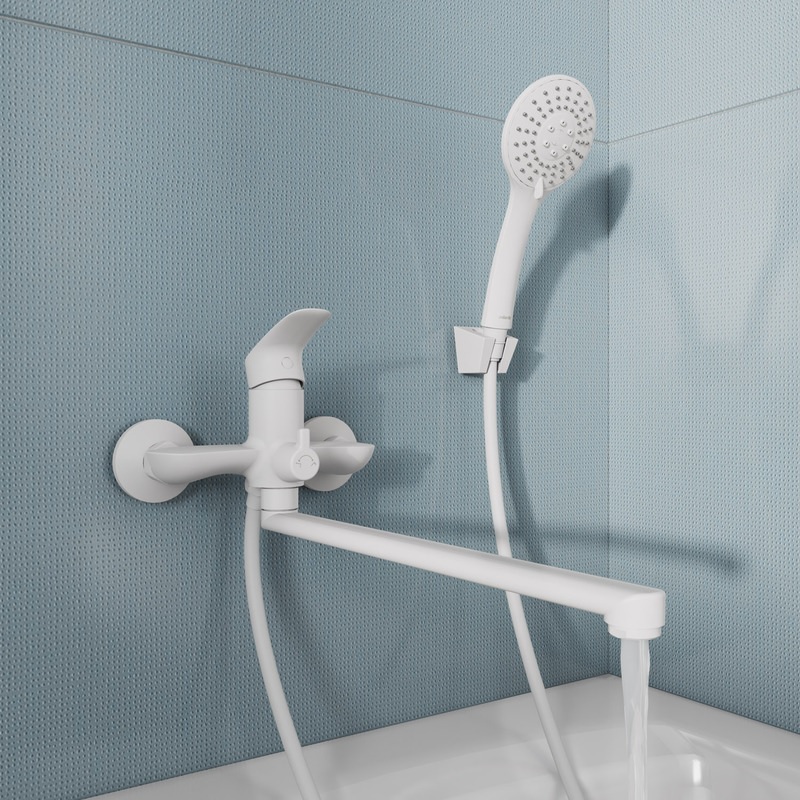 Смеситель для ванны Rora отличается универсальным характером: основной акцент в его дизайне приходится на плавные линии корпуса и трендовый белый цвет. Наличие длинного (35 см) излива позволяет использовать пространство ванны максимально эффективно. Интенсивность и температура потока легко регулируются удобной ручкой смесителя. Поворотный дивертор работает при любом давлении воды, переключая поток воды на большую душевую лейку (ø 100 мм) или в комбинированном режиме.
