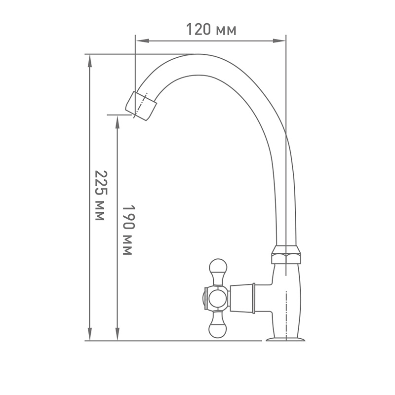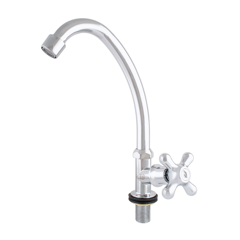 Предназначен для монтажа на раковину, столешницу и мойку с помощью шпильки, фигурной скобы и прокладок. Кран оснащен крестообразным пластиковым маховиком и вертикальным трубчатым изливом. Выполнен из цинкового сплава, стойкого к коррозии, давлению и перепаду температур. Кран-буксы выполнены из латуни с металлокерамическими запорными пластинами. Излив выполнен из нержавеющей стали и оснащен качественным аэратором с пластиковым сердечником.