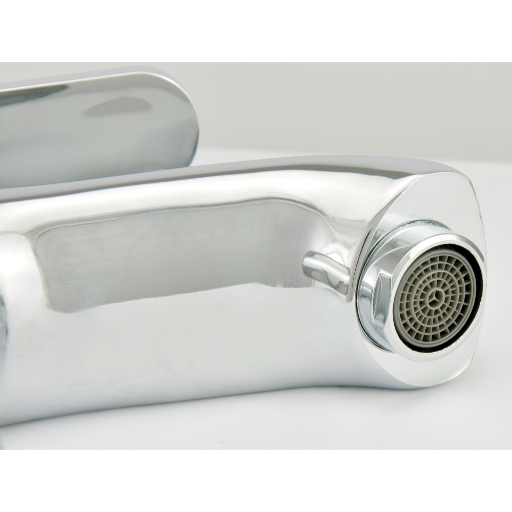 Данная модель представляет собой надежный и современный смеситель с горизонтальным способом установки, устанавливается на мойку или столешницу. Тип крепления – гайка. Смеситель имеет литой, монолитный излив (гусак), плавно переходящий в корпус, длина которого 110 мм, эко-сеточка аэратора выполнена из долговечного ABS-пластика, насыщает воду кислородом, и позволяет уменьшить ее расход.