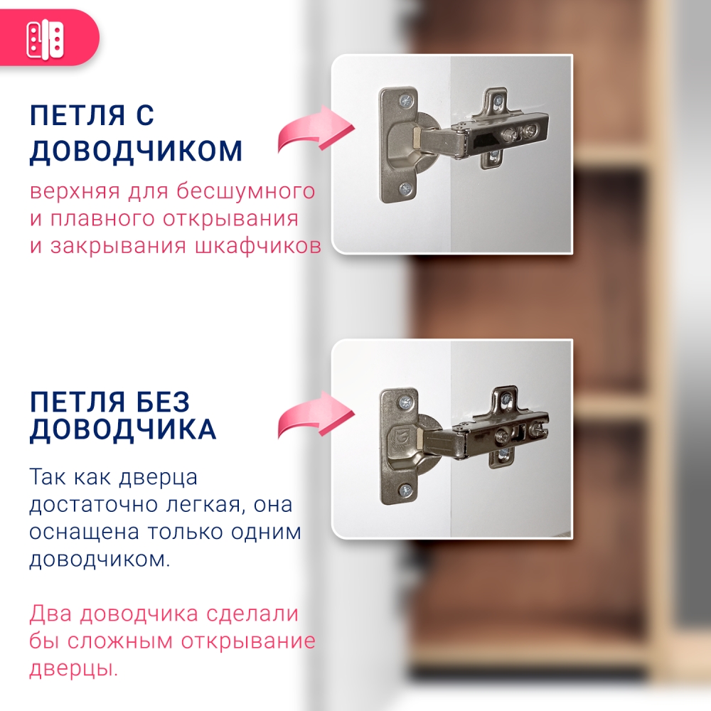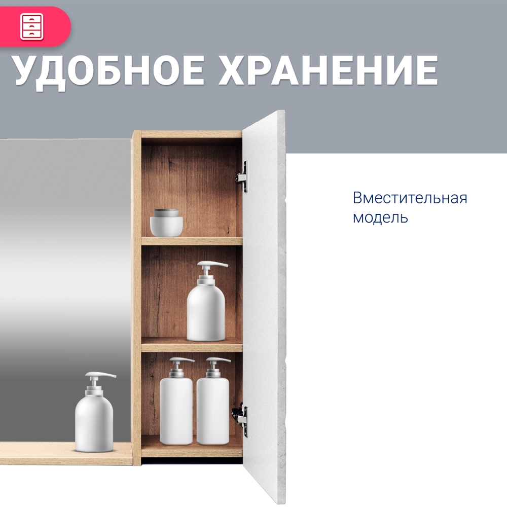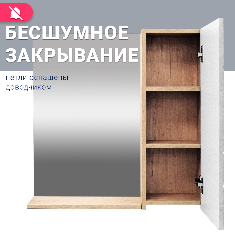 Зеркало-шкаф Doratiz «Фьорд 70», имеет две деревянные полочки, которые позволяют удобно хранить средства для ухода. Дверца зафиксирована с помощью двух петель, одна из которых с доводчиком. Это обеспечивает плавное и бесшумное открывание и закрывание мебели.