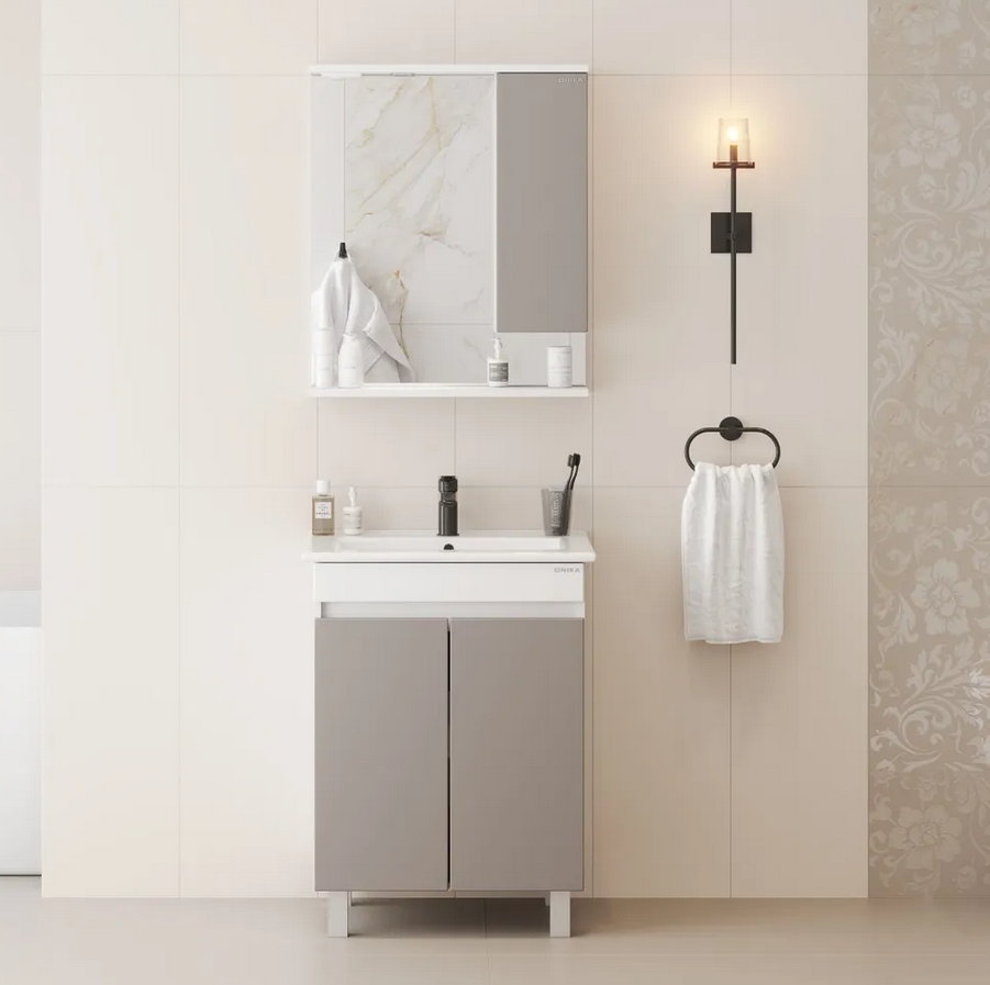 Корпус шкафа-зеркала выполнен из ЛДСП, фасад - из ЛМДФ в матовой пленке, устойчивых к механическим воздействиям, перепадам температур и высокой влажности.