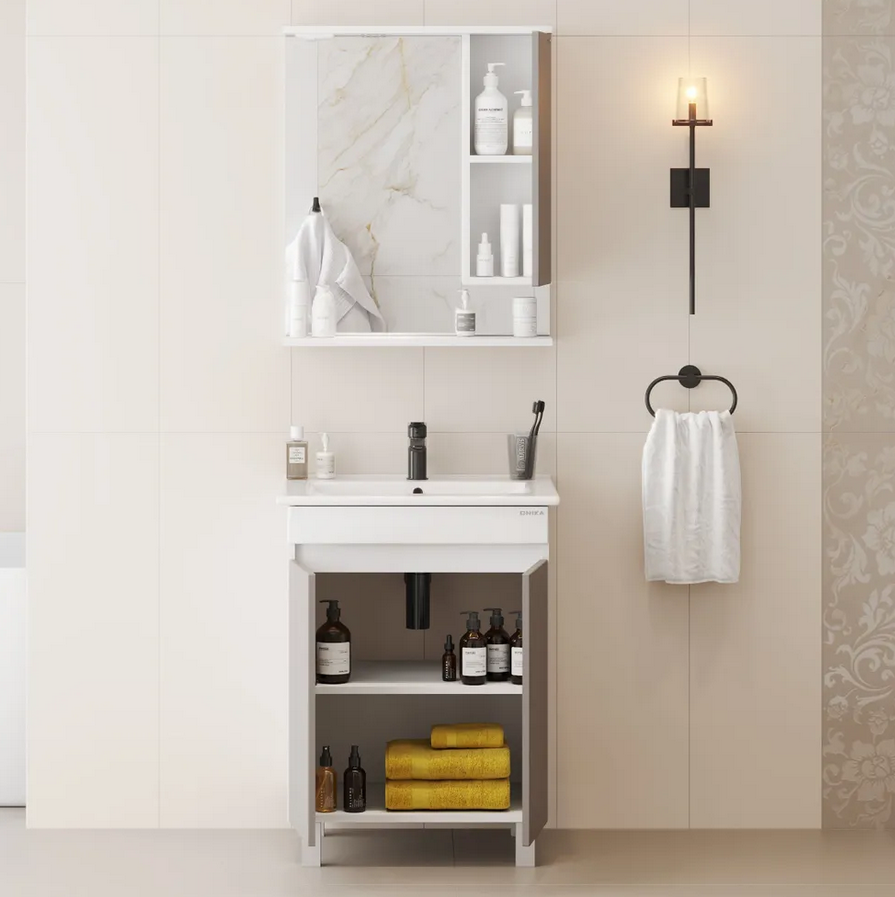 Несмотря на небольшие размеры, шкаф достойно выполнит задачу по хранению: пространство за распашной дверцей с доводчиком позволяет разместить необходимые мелочи, а открытую полку можно использовать для декора или часто используемых предметов.