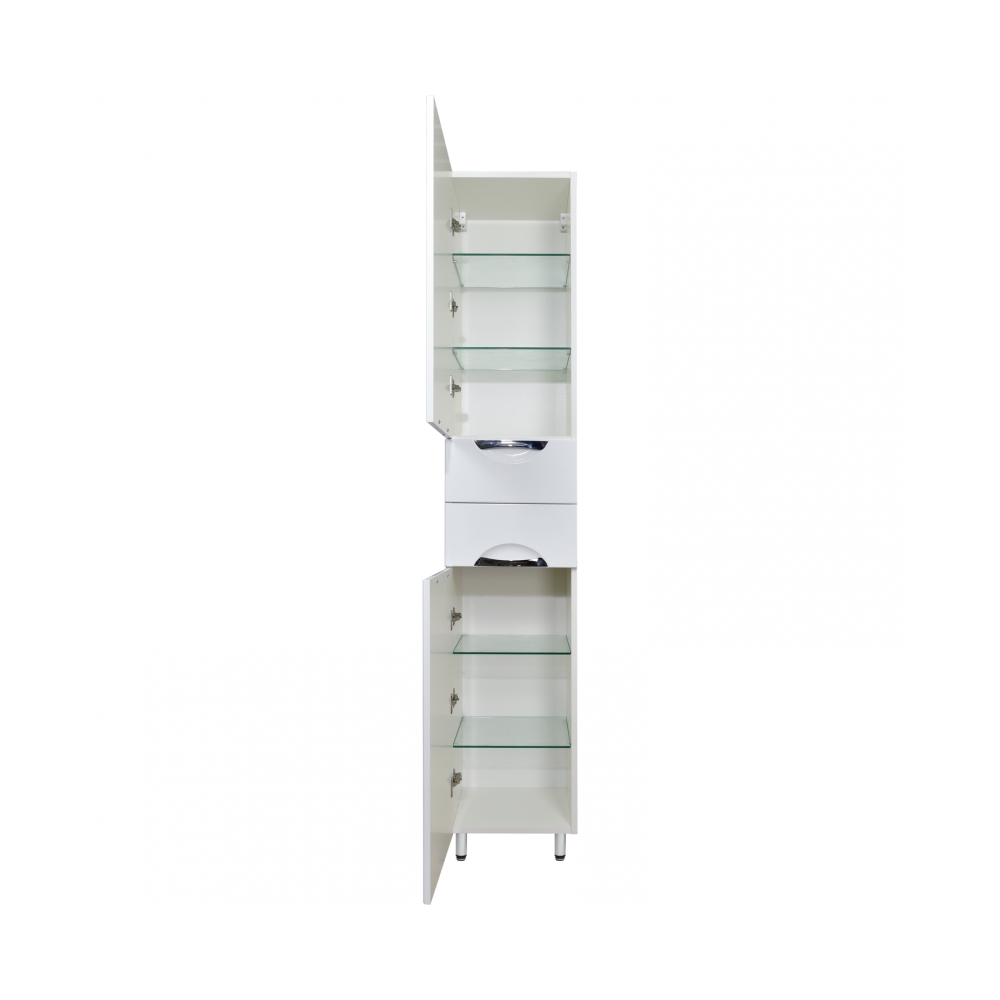 Пенал оборудован удобными вместительными полками и двумя ящиками с направляющими плавного выдвижения. Это поможет разместить в небольшом помещении все необходимое: полотенца, косметику, халаты, различные необходимые банные принадлежности.
