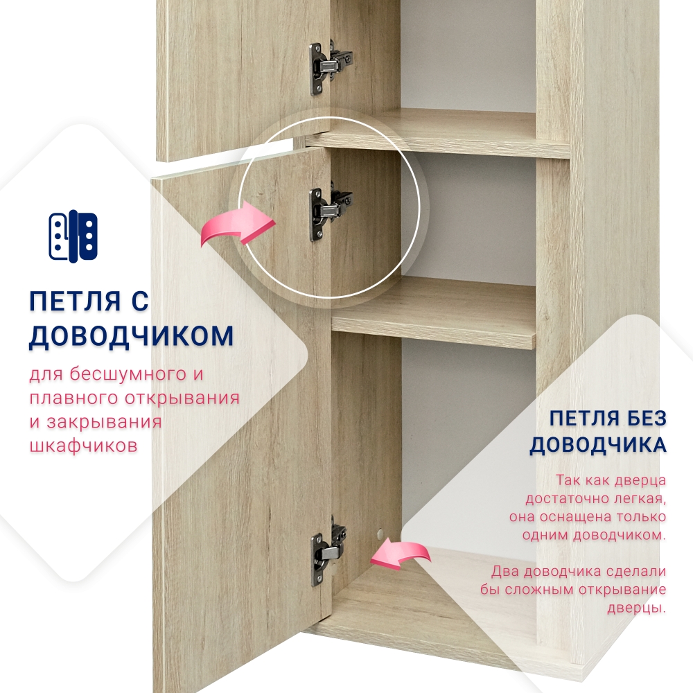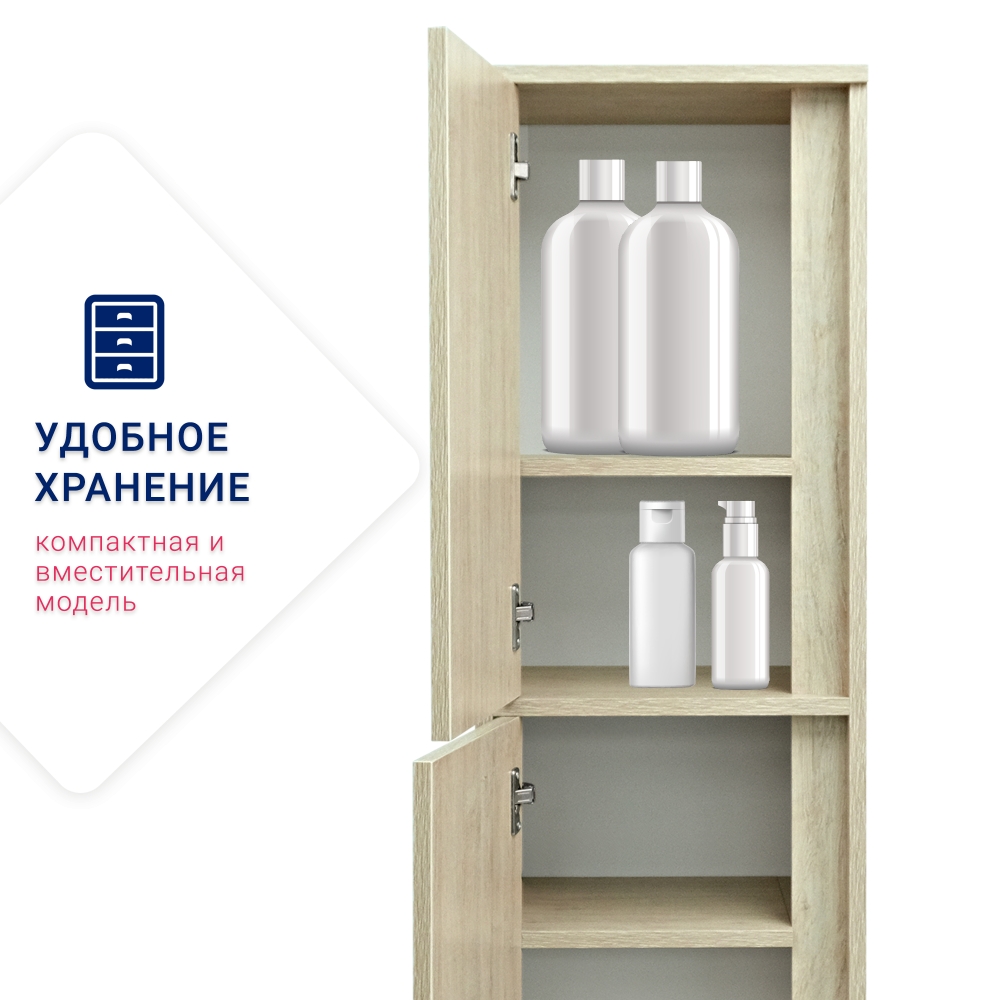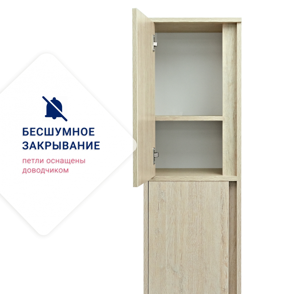 Пенал оборудован удобными вместительными полками. Это поможет разместить в небольшом помещении все необходимое: полотенца, косметику, халаты, различные необходимые банные принадлежности.