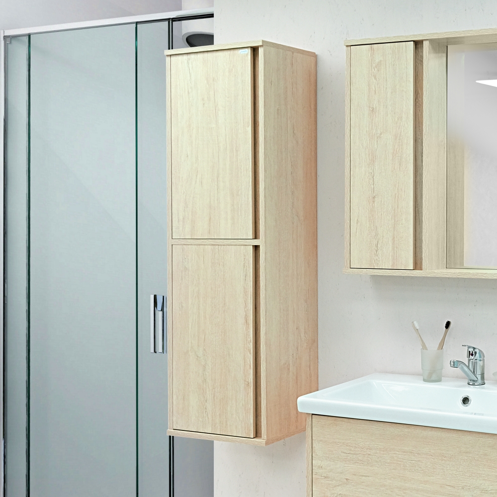 Стильный и вместительный подвесной шкаф, исполненный в модном цвете пикар. За двумя фасадами из влагостойкого ЛДСП размещаются деревянные полочки для удобной организации хранения косметики и аксессуаров. Пенал - это рациональное решение по-максимуму использовать пространство в ванной комнате не в ширину, а в высоту. Он обладает весьма демократичной ценой и идеальными габаритами.