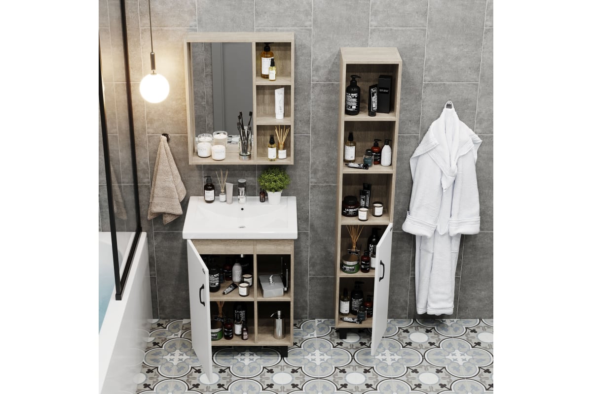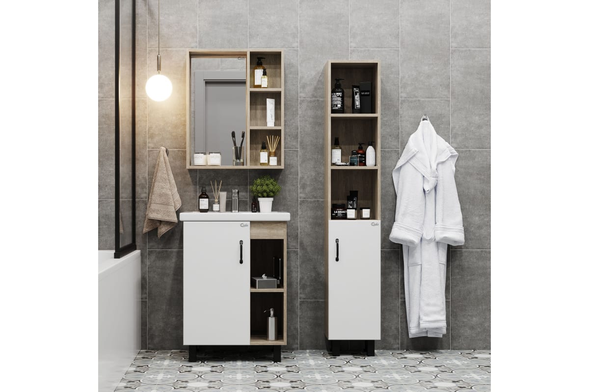 Открытые полки сверху обеспечивают быстрый доступ к часто используемым аксессуарам, а пространство за распашной дверцей снизу, снабженной системой плавного закрывания, станет удобным местом для хранения различных бытовых принадлежностей.
