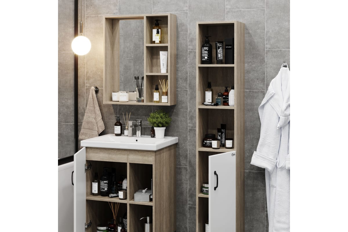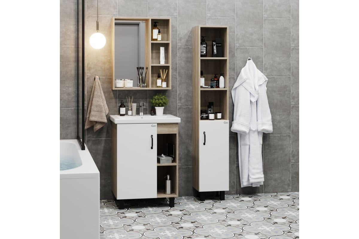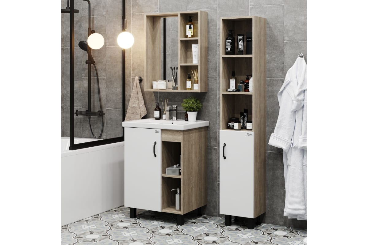 Напольный пенал для ванной комнаты пенал Onika ТИМБЕР 30 удачно сочетает в себе контрастные цвета и фактуры: белый матовый фасад с покрытием SoftTouch, корпус цвета дуб сонома с роскошной текстурой, черная матовая металлическая фурнитура.