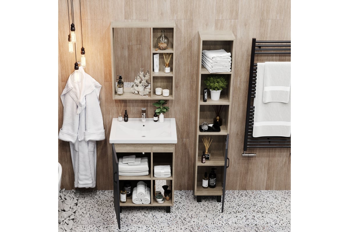 Открытые полки сверху обеспечивают быстрый доступ к часто используемым аксессуарам, а пространство за распашной дверцей снизу, снабженной системой плавного закрывания, станет удобным местом для хранения различных бытовых принадлежностей.