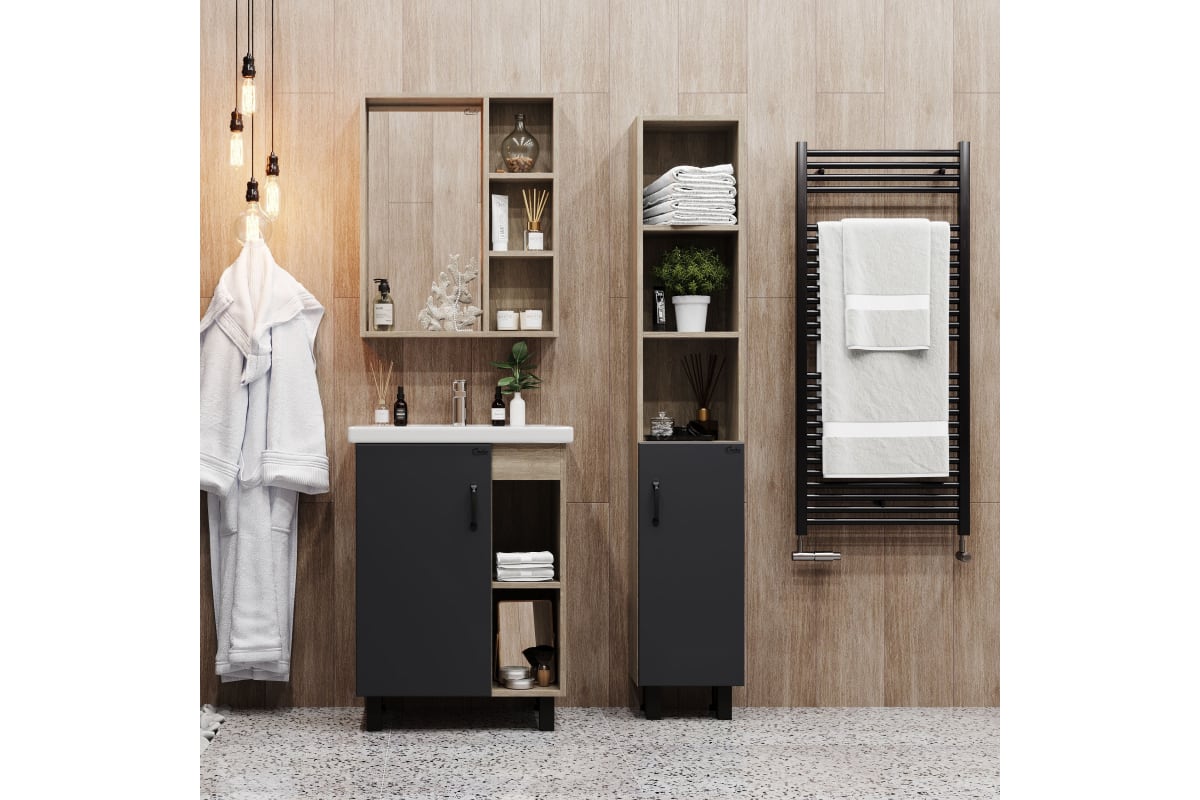Напольный пенал для ванной комнаты пенал Onika ТИМБЕР 30 удачно сочетаются контрастные цвета и фактуры: серый матовый фасад с покрытием SoftTouch, корпус цвета дуб сонома с роскошной текстурой, черная матовая металлическая фурнитура.