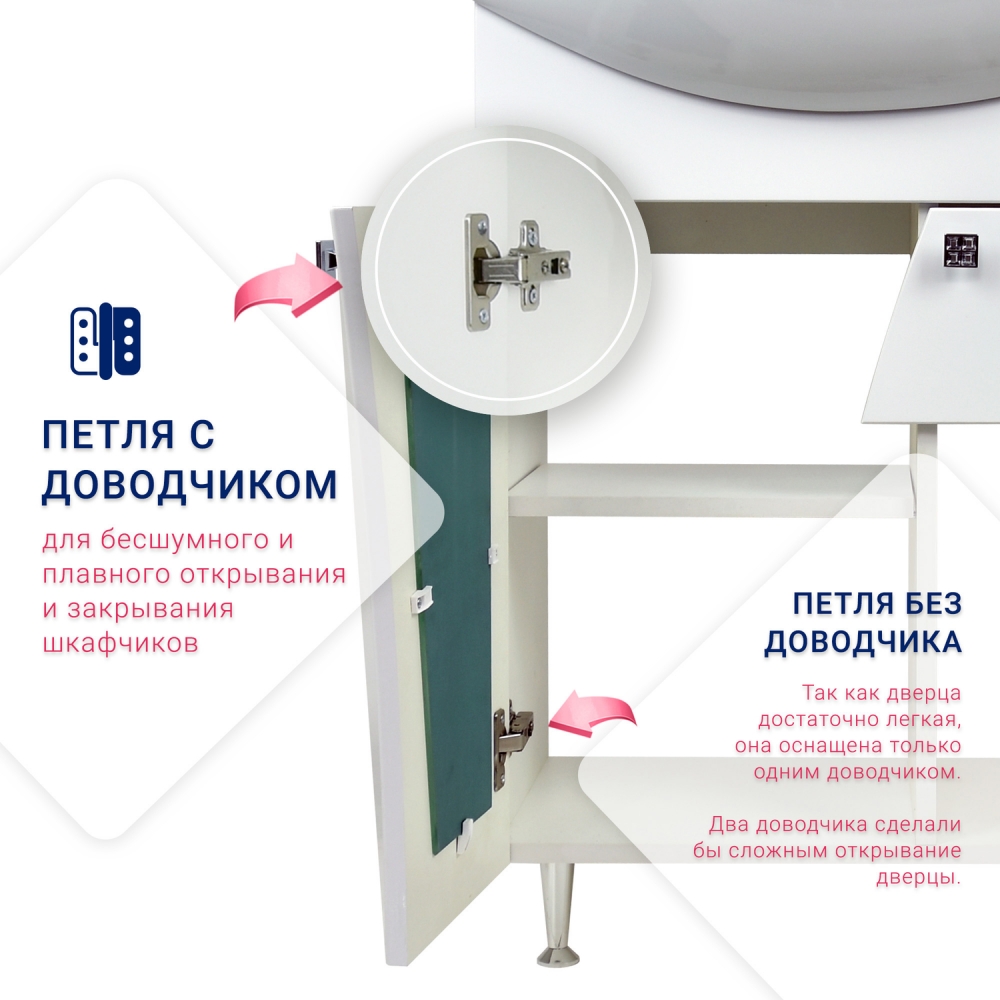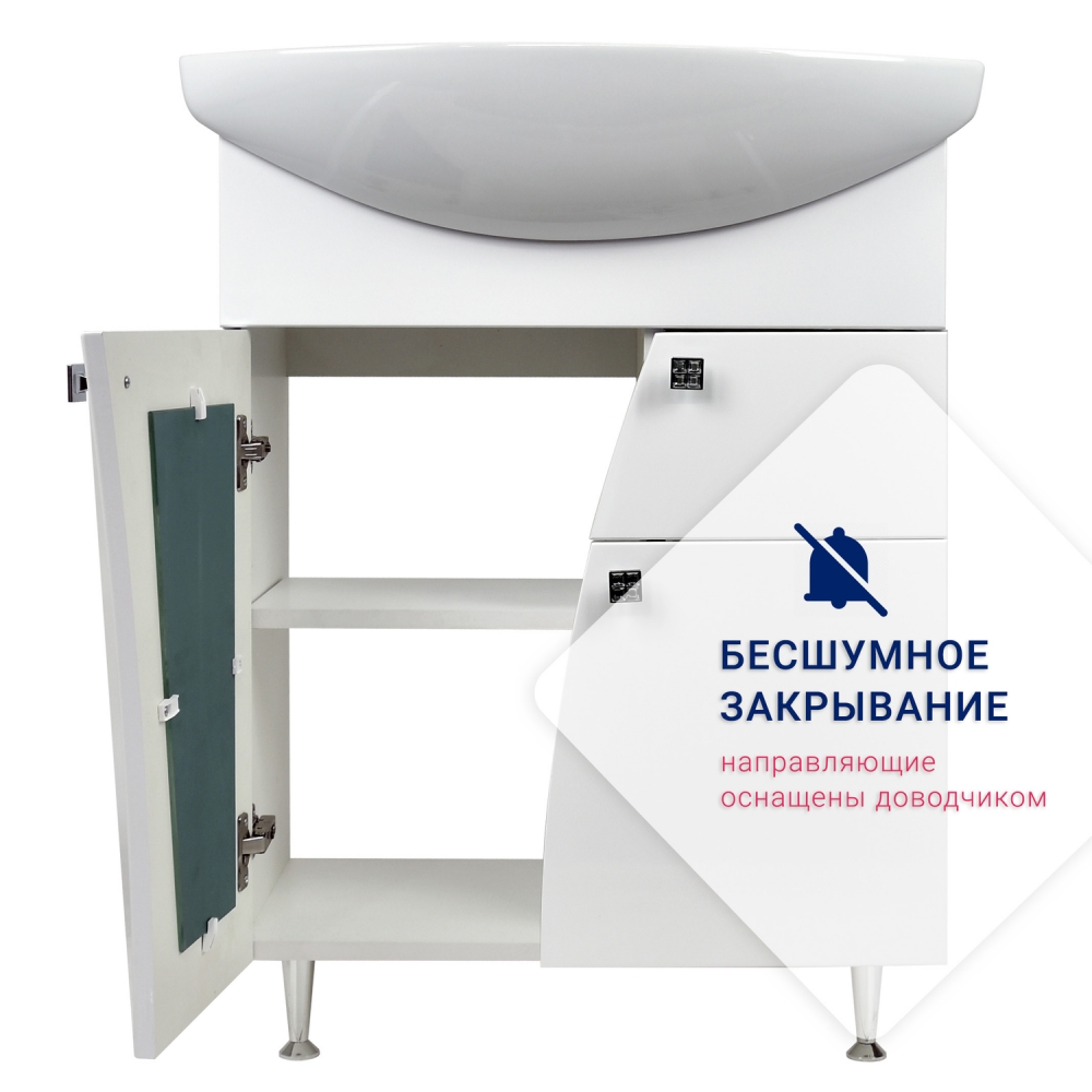 Тумба комплектуется регулируемыми по высоте опорами и фурнитурой. Дверцы снабжены доводчиками, что обеспечивает удобное и плавное закрывание.