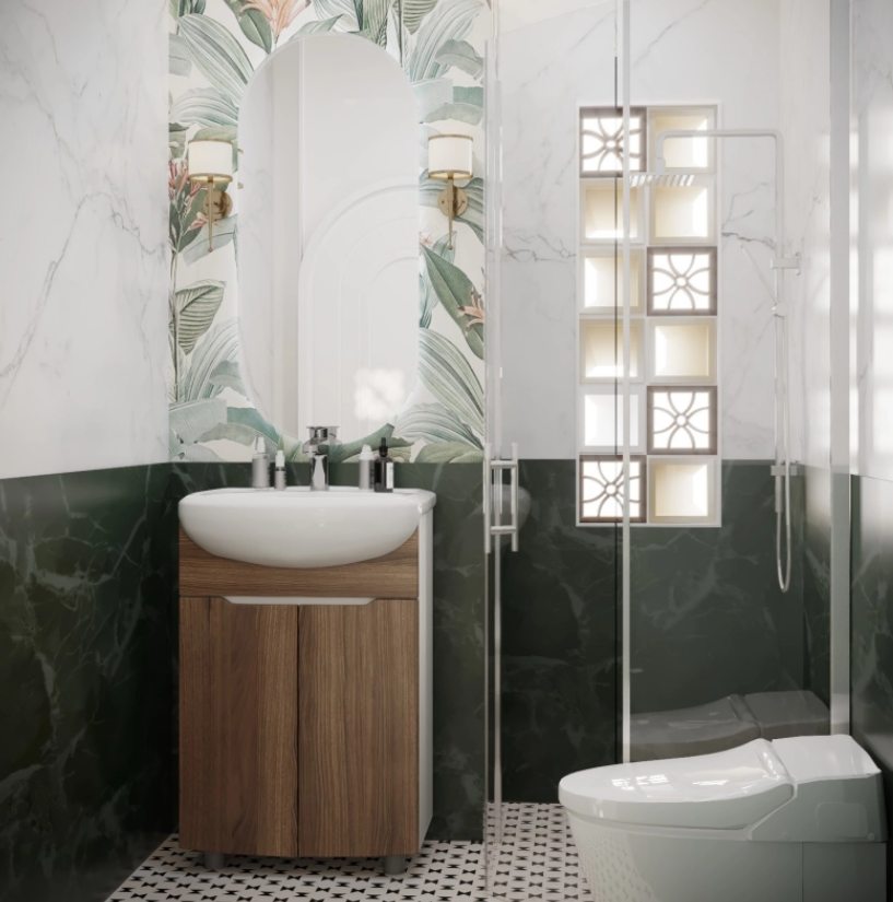 Мебель выглядит эффектно и актуально благодаря сочетанию глубокого темного оттенка под дерево с белым цветом.