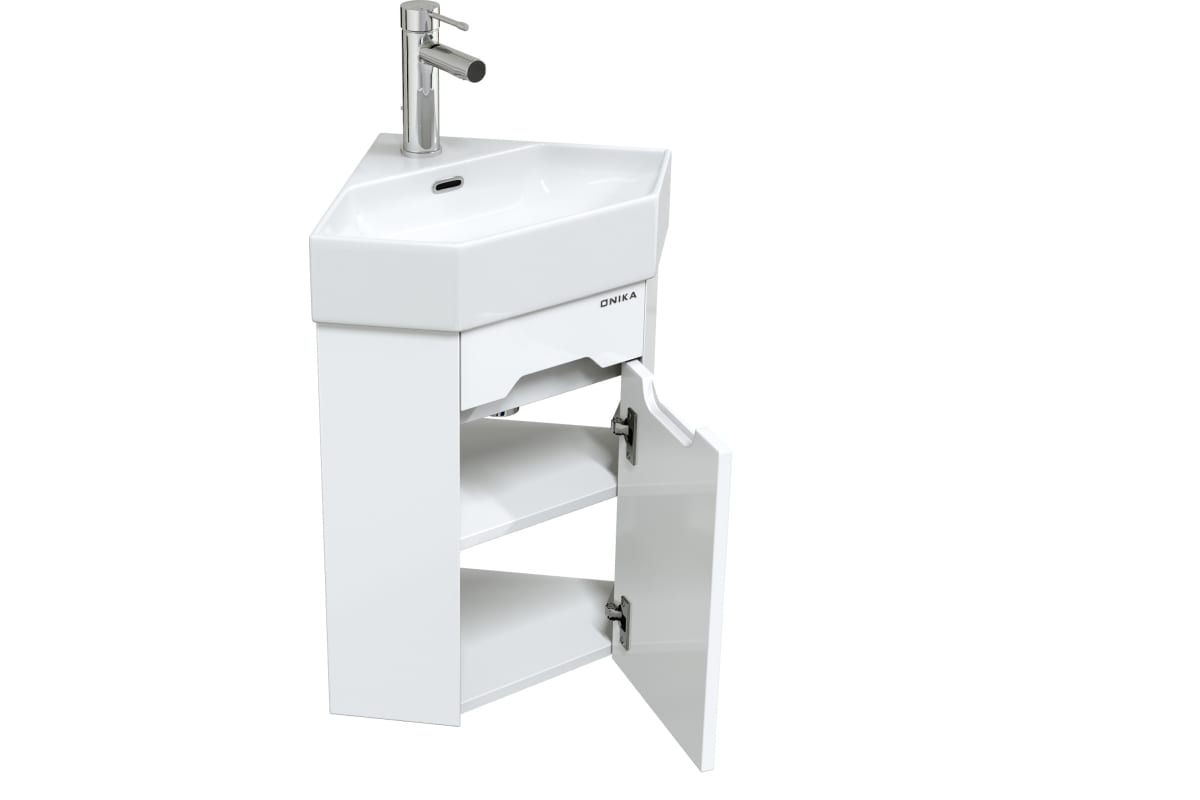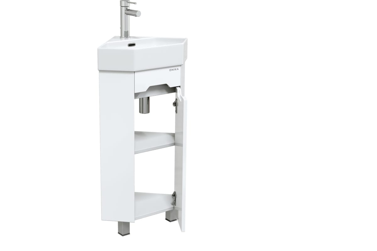 Угловая напольная тумба для ванной комнаты Onika Айленд 35 сочетает в себе стильный минималистичный дизайн, белую глянцевую поверхность и высочайшее качество исполнения.