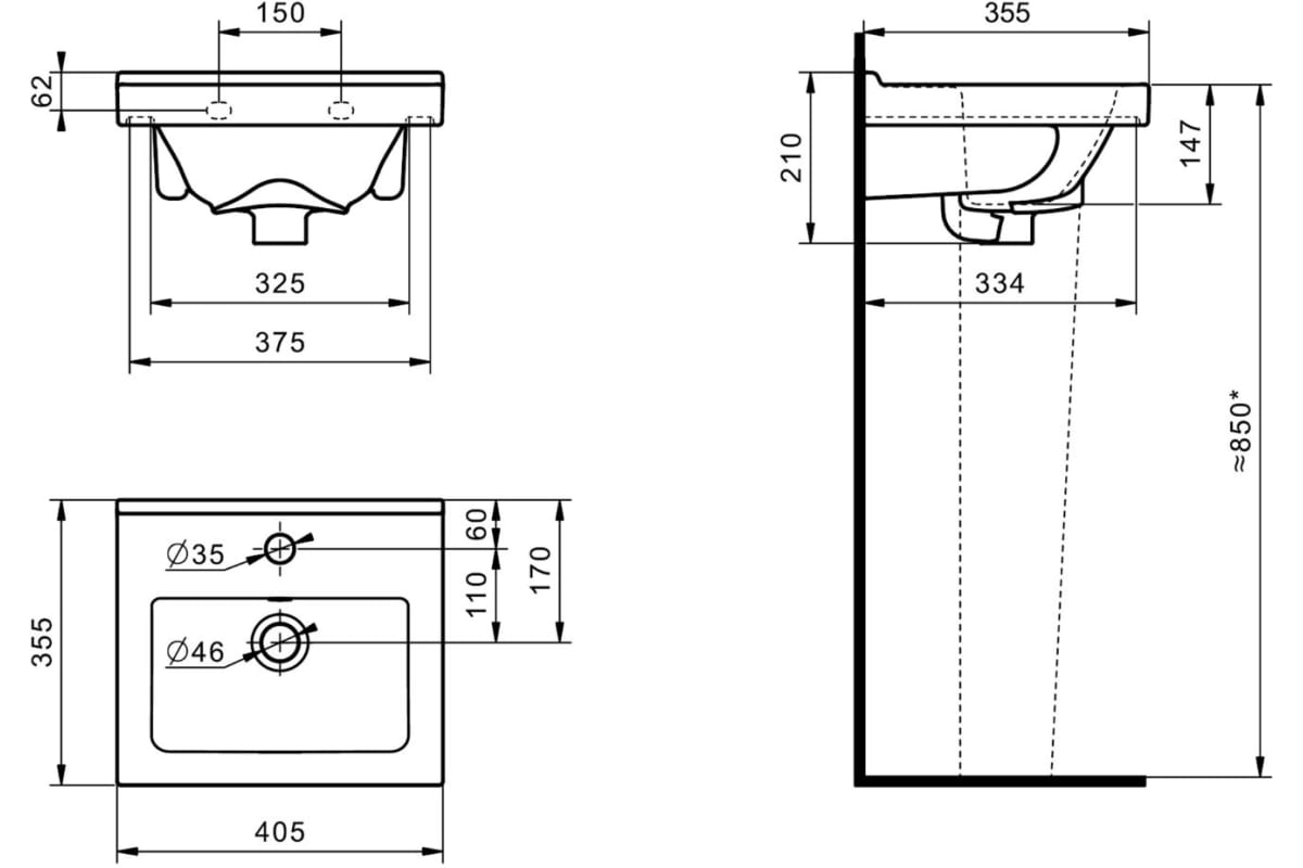 Диаметр сливного отверстия - 46 мм