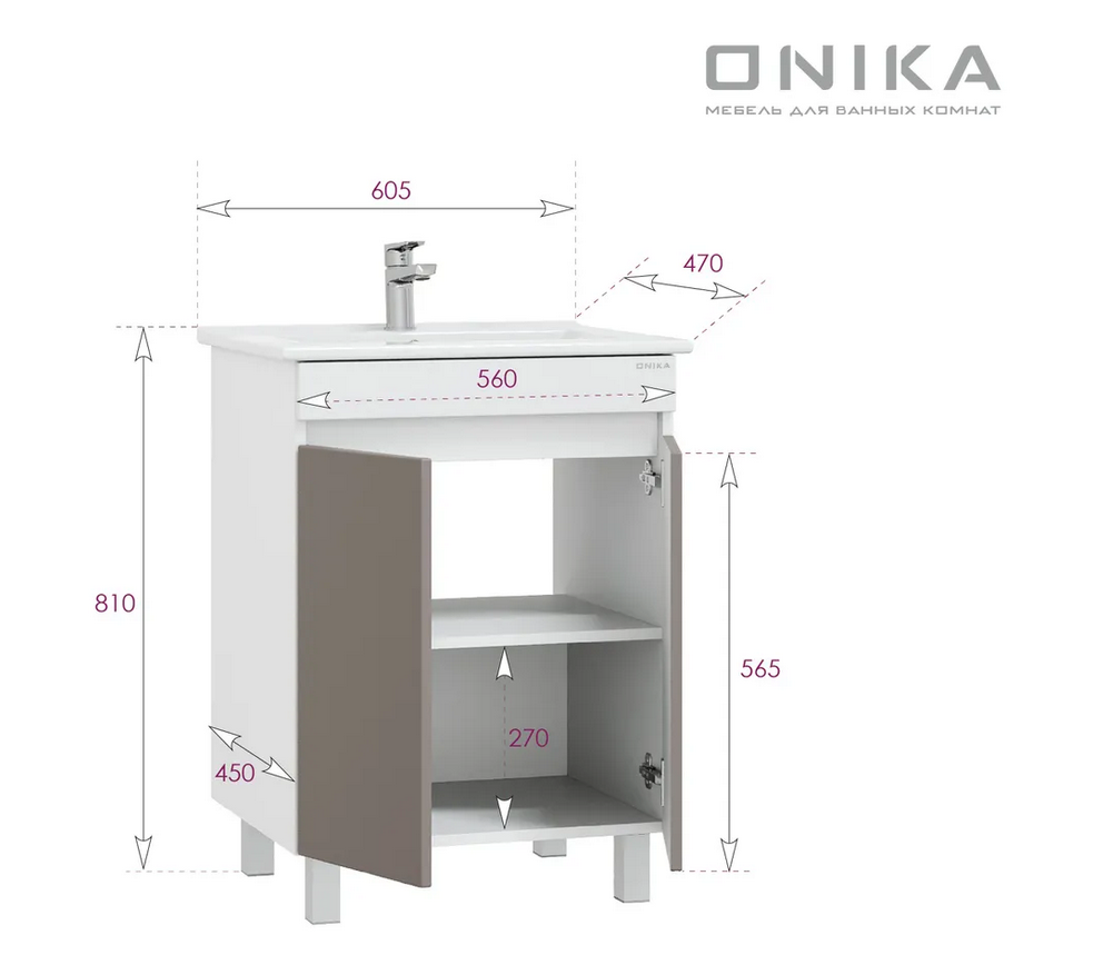 Размеры тумбы без учета раковины и ножек 56x45x68 см.