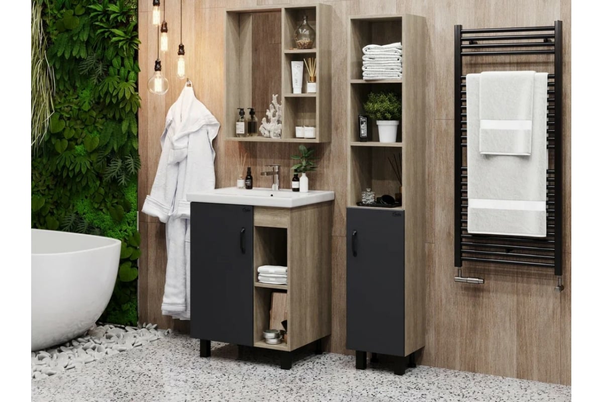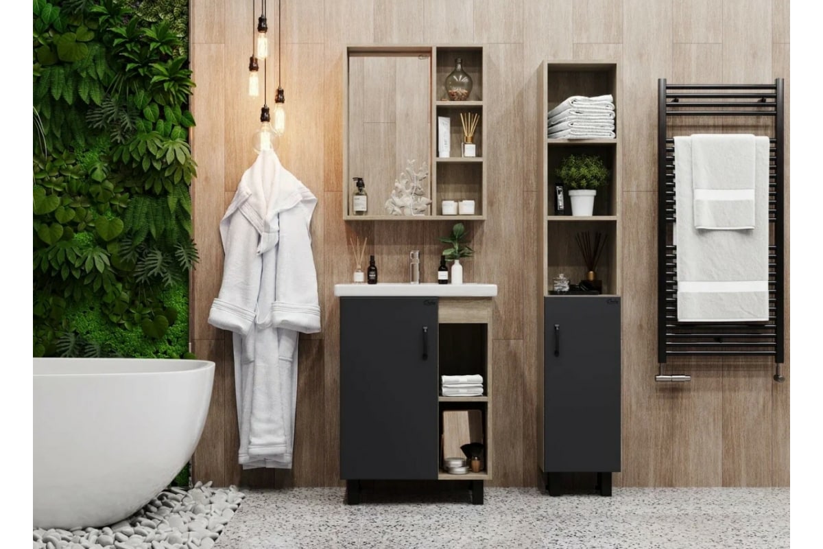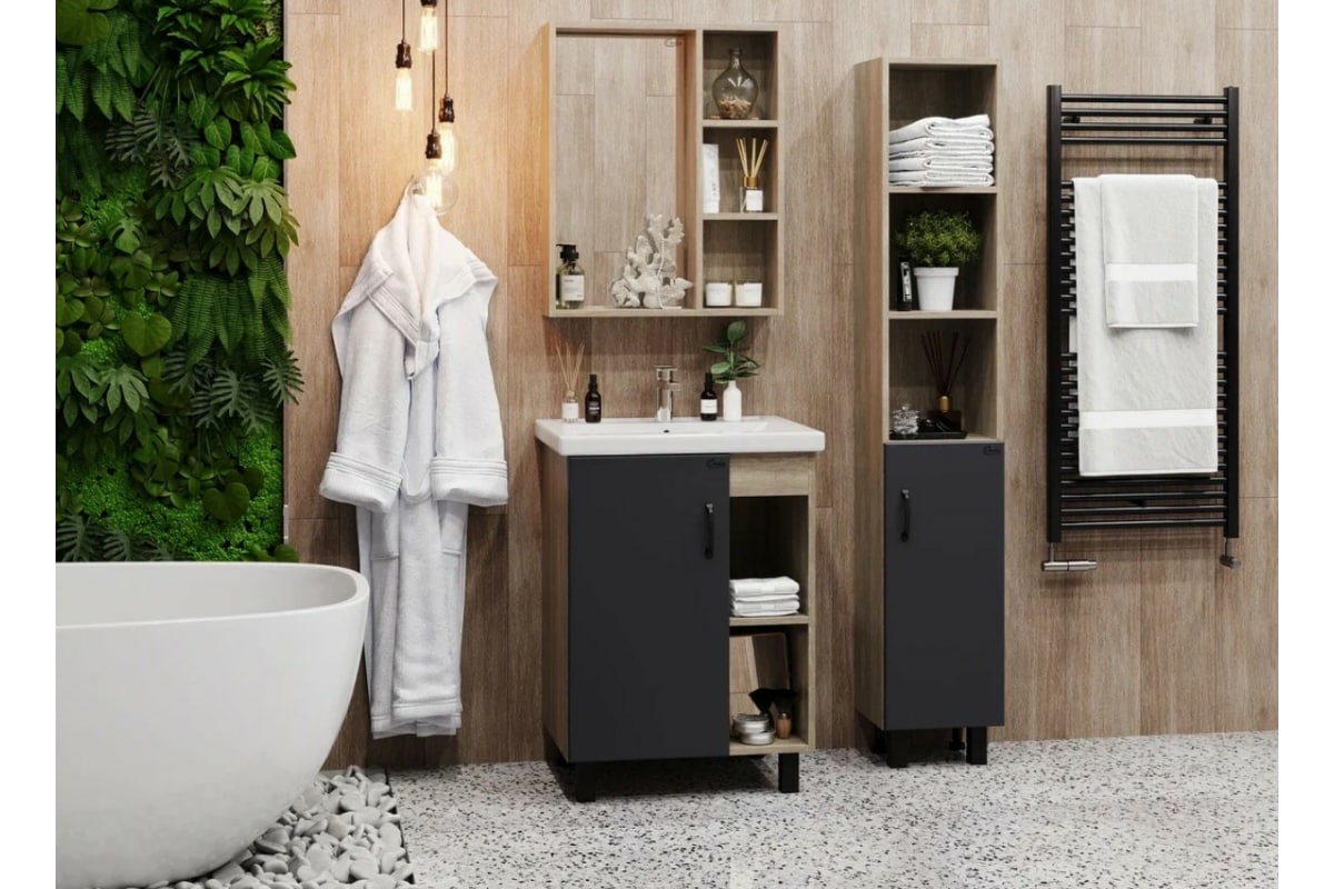 В тумбе с раковиной Onika ТИМБЕР серый матовый/дуб сонома 60.01 106116 удачно сочетаются контрастные цвета и фактуры: серый матовый фасад с покрытием SoftTouch, корпус цвета дуба с роскошной текстурой, черная матовая металлическая фурнитура.