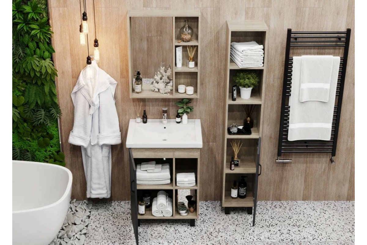 Открытые полки справа обеспечивают быстрый доступ к часто используемым аксессуарам, а пространство за распашной дверцей слева, снабженной системой плавного закрывания, станет удобным местом для хранения различных бытовых принадлежностей.
