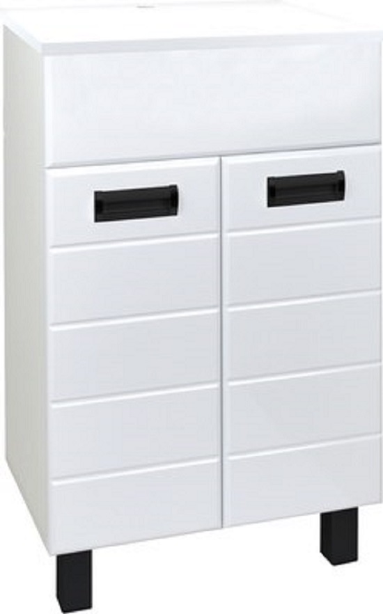 Тумба Вальс 50 напольная, белая, под умывальник Сомо 50 9908.177 - современная модель мебели для ванной комнаты со строгой горизонтальной фрезеровкой и черной фурнитурой. Каждая деталь этой мебели сочетает в себе практичность и функциональность.