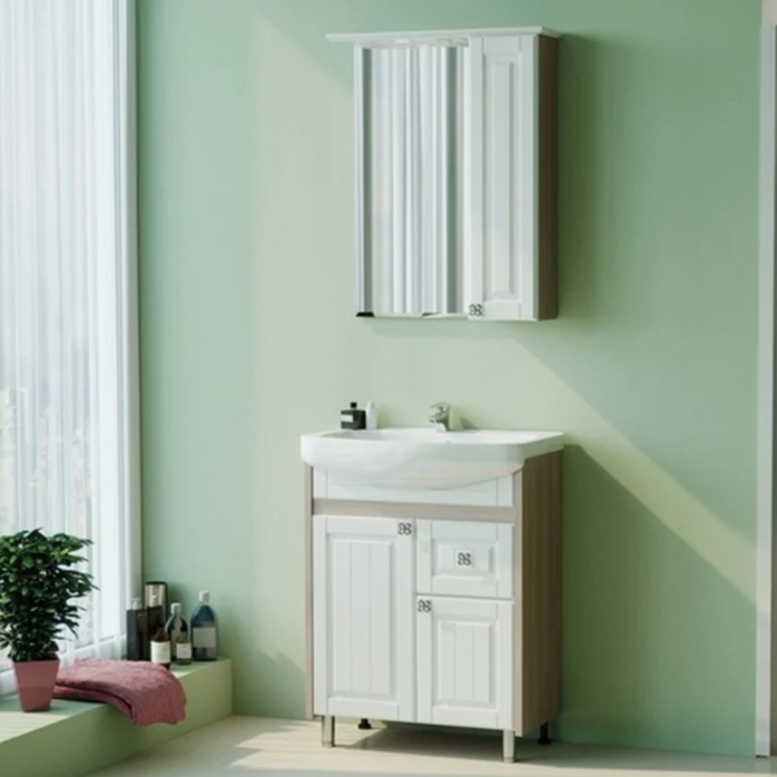 Каждый элемент этой коллекции функционален, отделка под натуральное дерево и необычные ручки превращают эту мебель в стильное украшение ванной комнаты. Геометрически правильные комбинированные фасады комплекта мебели "ВЕРСАЛЬ" удачно обыграют интерьер ванной, а необычные ручки на тумбе и шкафчике добавят в него оригинальности.