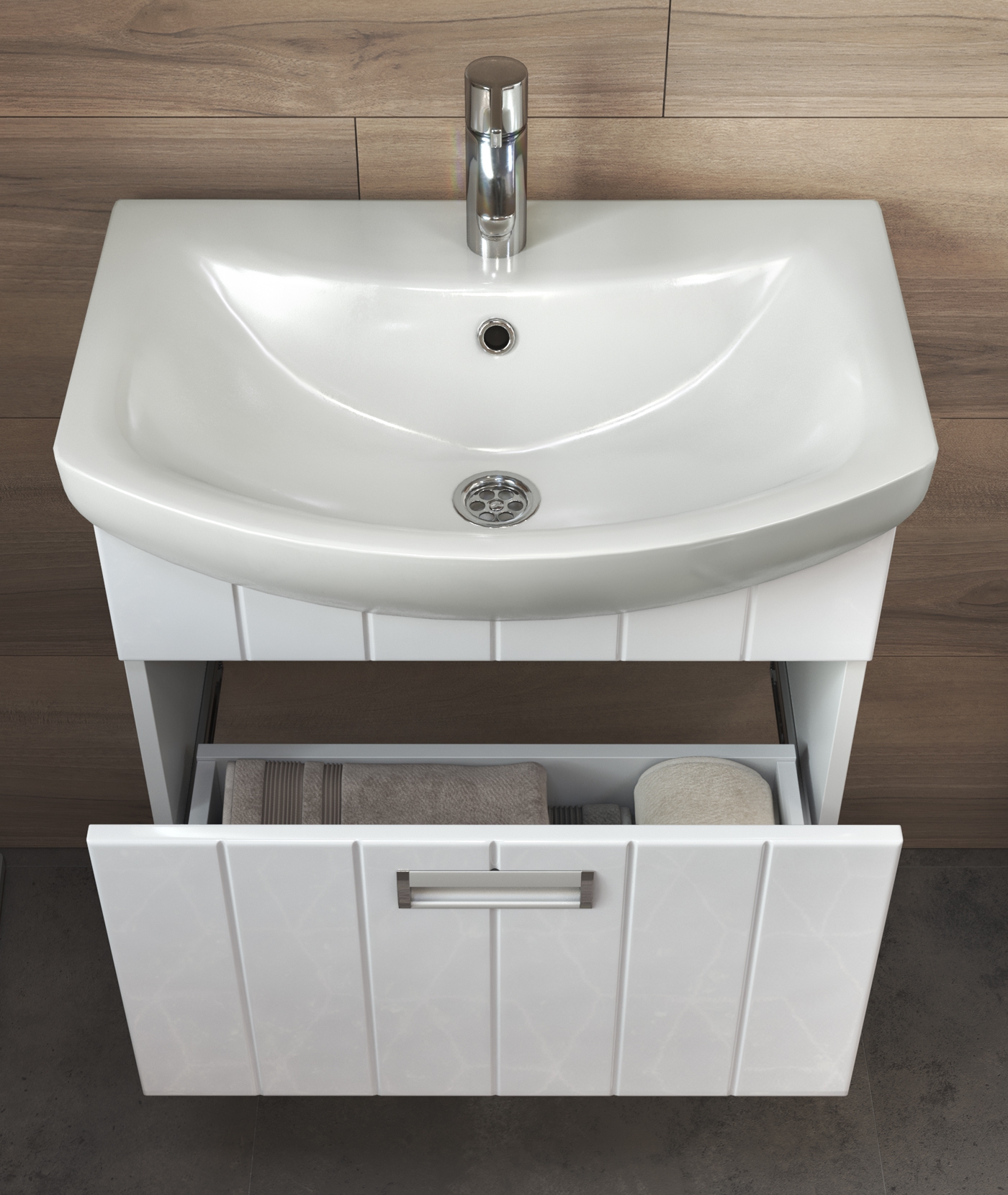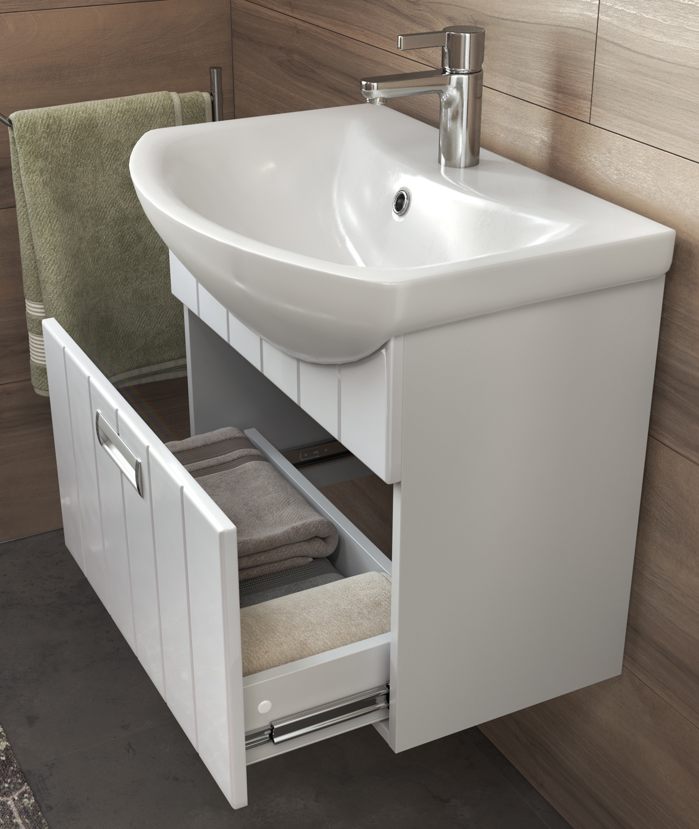 Оснащение: 1 выдвижной ящик; направляющие полного выдвижения; ручка врезная металлическая хромированная