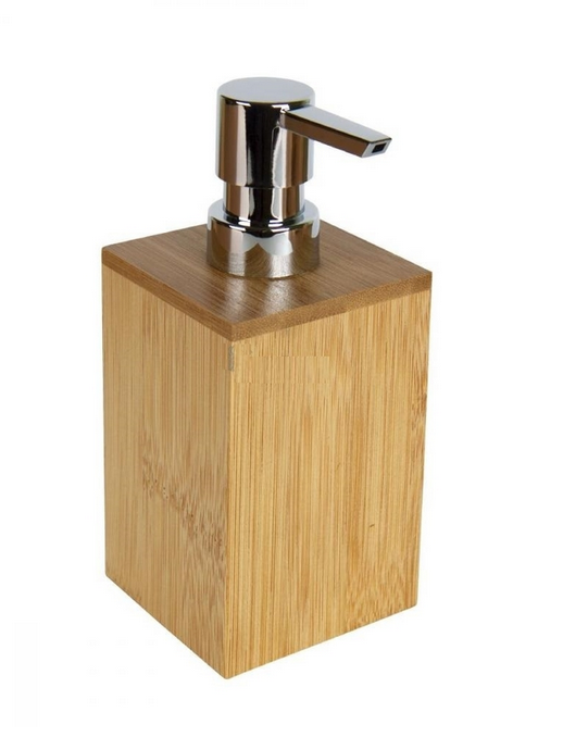 Дозатор настольный для ванной комнаты прямоугольной формы, предназначен для порционной подачи мыла, шампуней и других гелеобразных жидкостей. Объем 250мл. Изготовлен из натурального бамбука с пластиковым контейнером-вкладышем. Подача моющего средства осуществляется с помощью пластиковой хромированной помпы. Влагоустойчив.