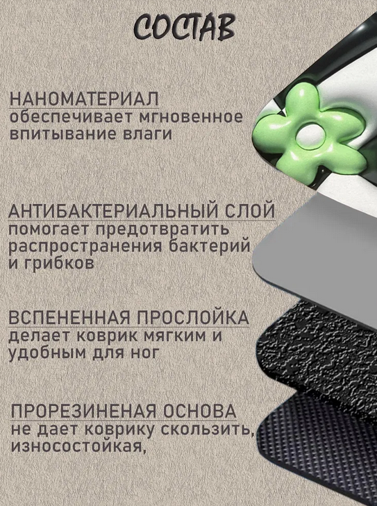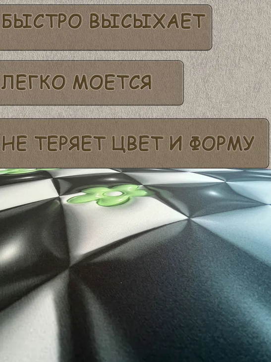 Тренд 2023 года - Влаговпитывающий 3Д-коврик для ванной комнаты и туалета. Коврик противоскользящий, так как имеет прорезиненную основу и очень хорошо впитывает влагу! Вода быстро впитывается и высыхает за 15 минут. Безворсовый коврик имеет уникальные свойства – отличную впитываемость, отсутствие запахов, гигиеничность и отсутствие бактерий.