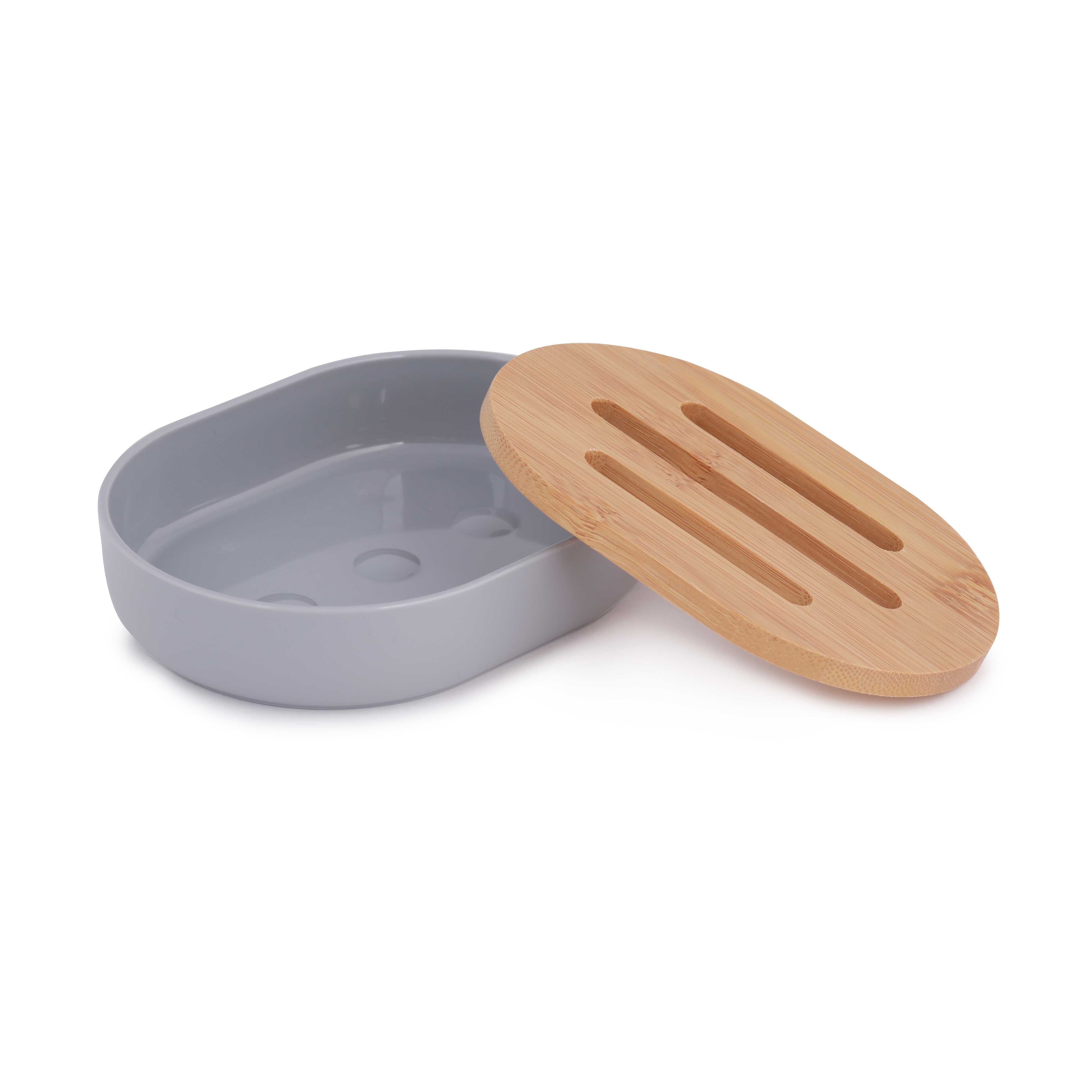 Мыльница имеет оригинальный дизайн за счет сочетания двух разных материалов.