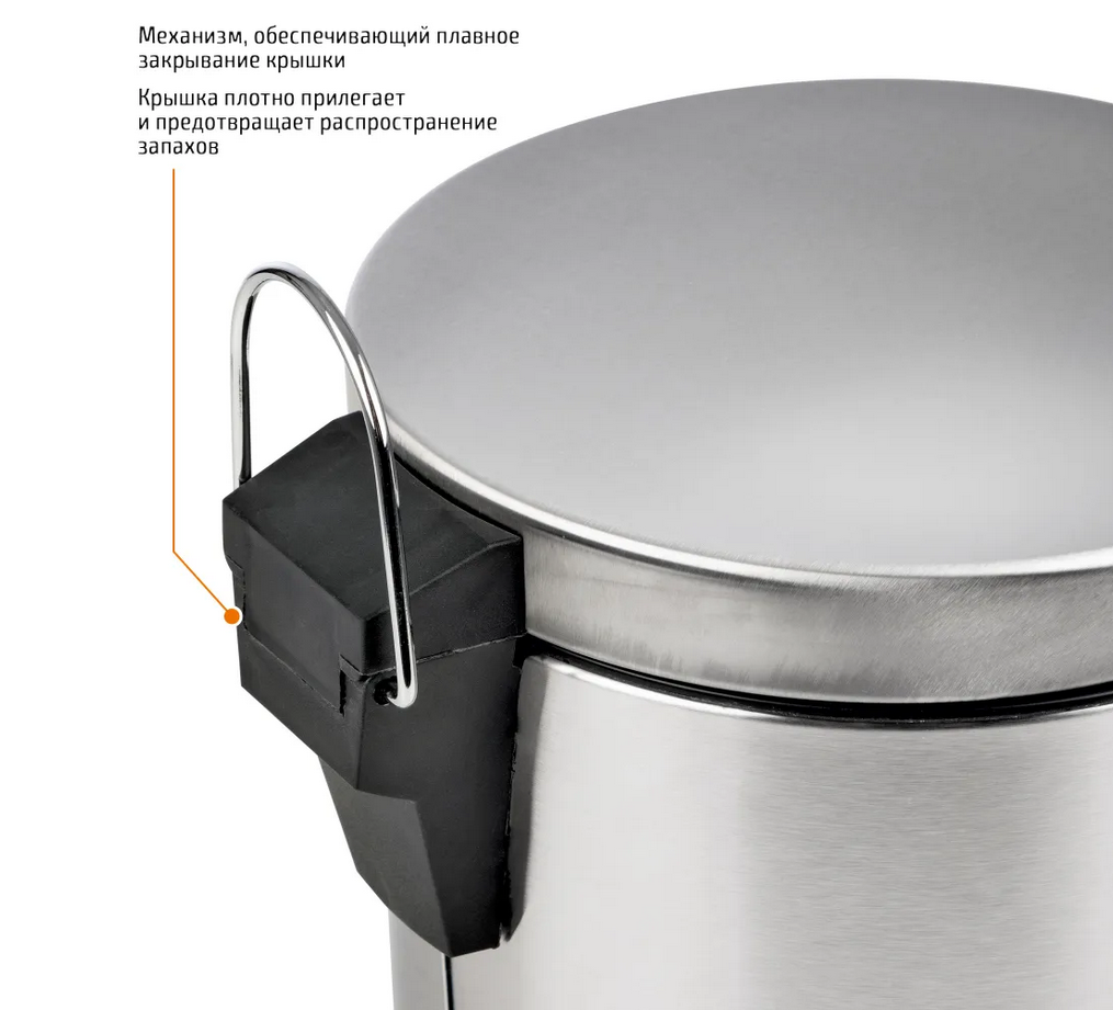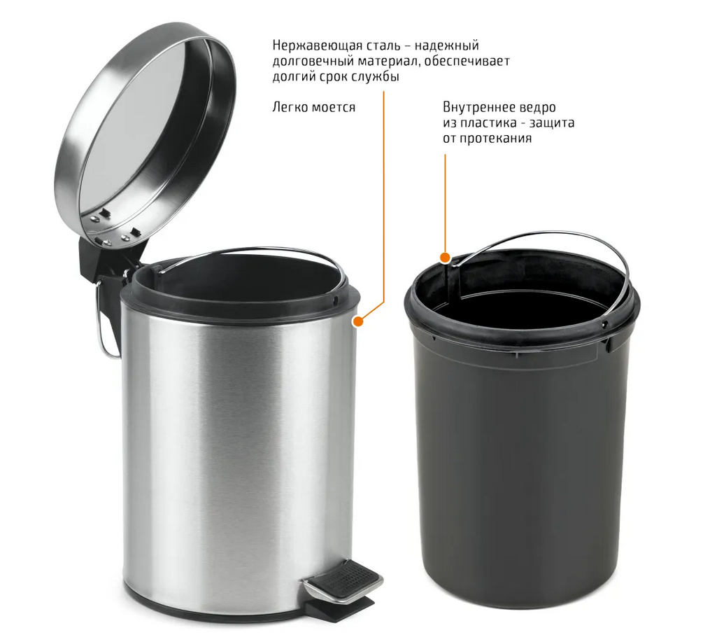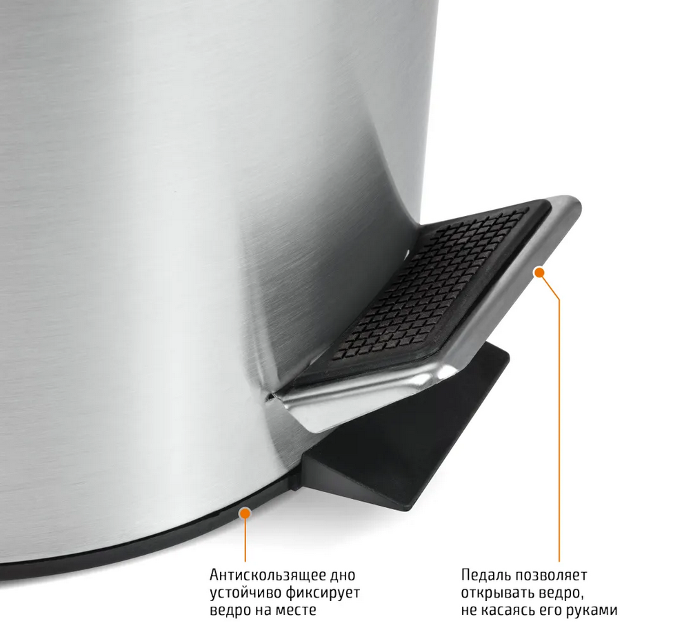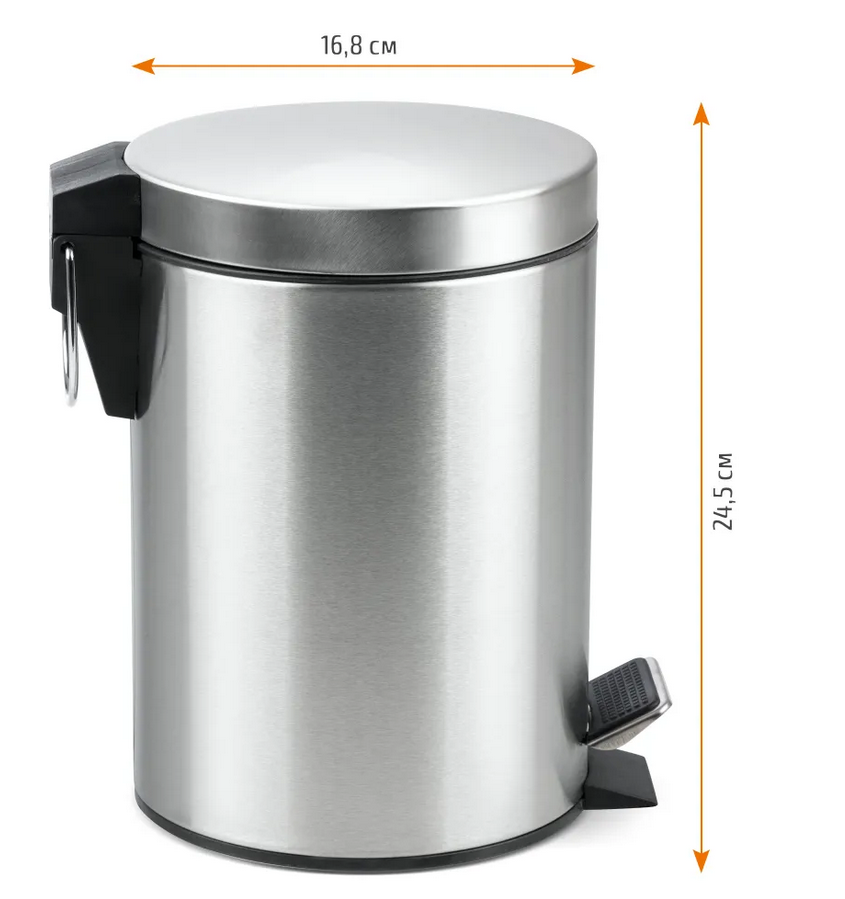 Ведро круглое для мусора с откидной крышкой предназначено для отходов, помогает поддержать порядок и чистоту, прекрасно подойдет для ванной комнаты, туалета или кухни. Изготовлено из нержавеющей стали и оборудовано педалью, с помощью которой можно открыть крышку не касаясь руками. Внутреннее пластиковое ведро -съемное, оснащенное металлической ручкой для переноса. При нажатии на педаль, крышка поднимается, плотно закрывает содержимое ведра, препятствуя распространению запахов. Нескользящая пластиковая основа ведра предотвращает повреждение пола.