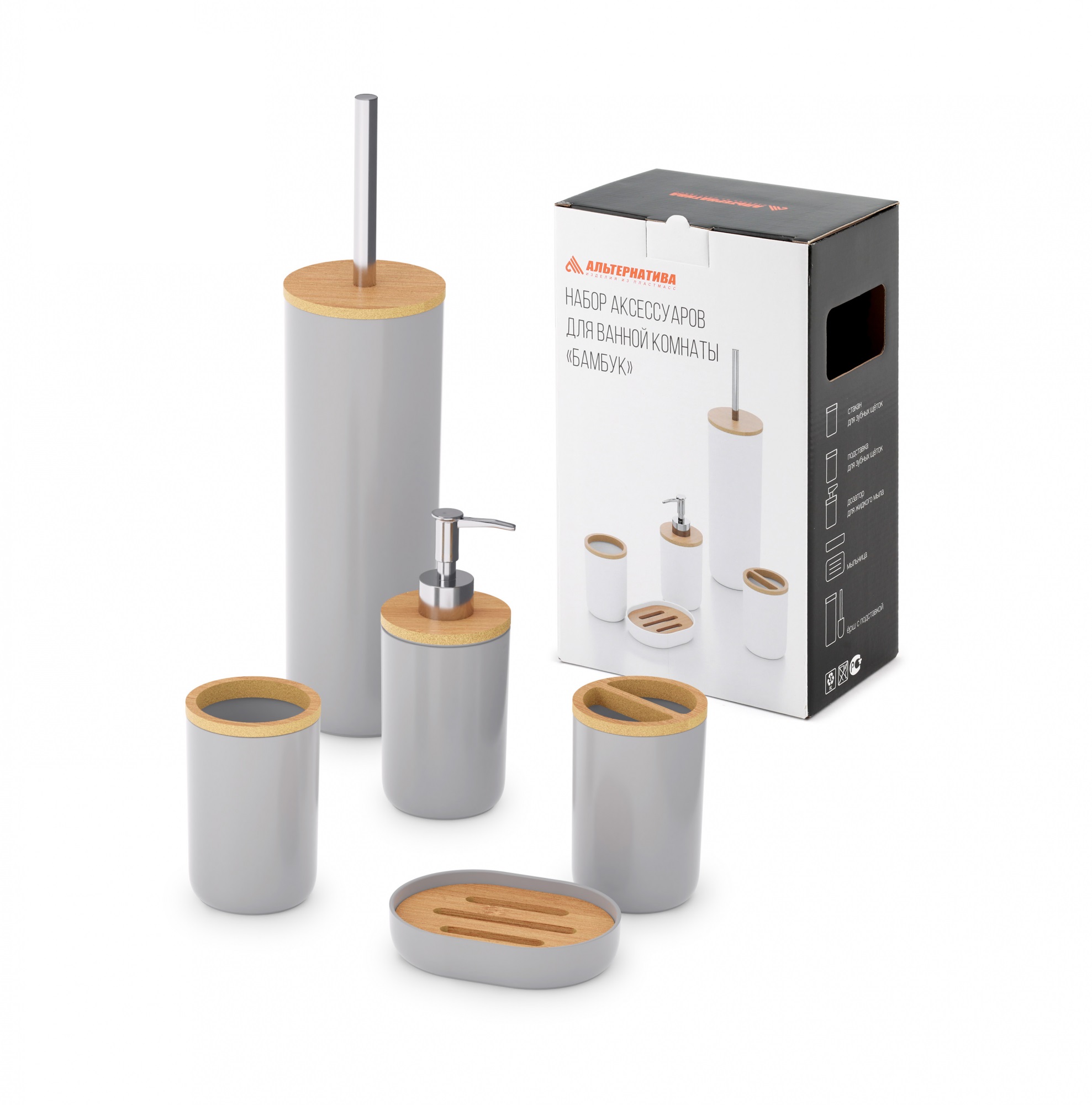 Набор для ванной комнаты "БАМБУК" серый 5 предметов М8169