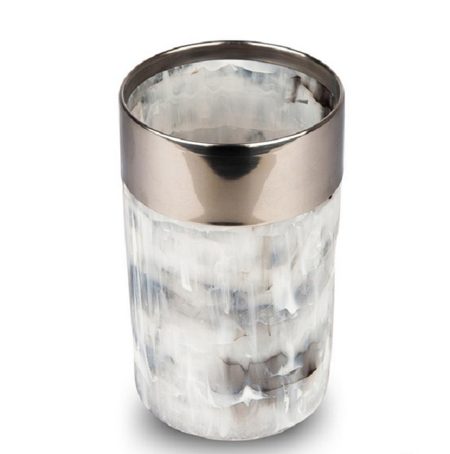 Стакан настольный Мрамор предназначен для хранения зубных щёток, а так же других предметов гигиены (бритвенный станок, кисточки). Имеет цилиндрическую форму. Изготовлен из пластика с хромированной окантовкой. Влагоустойчив.