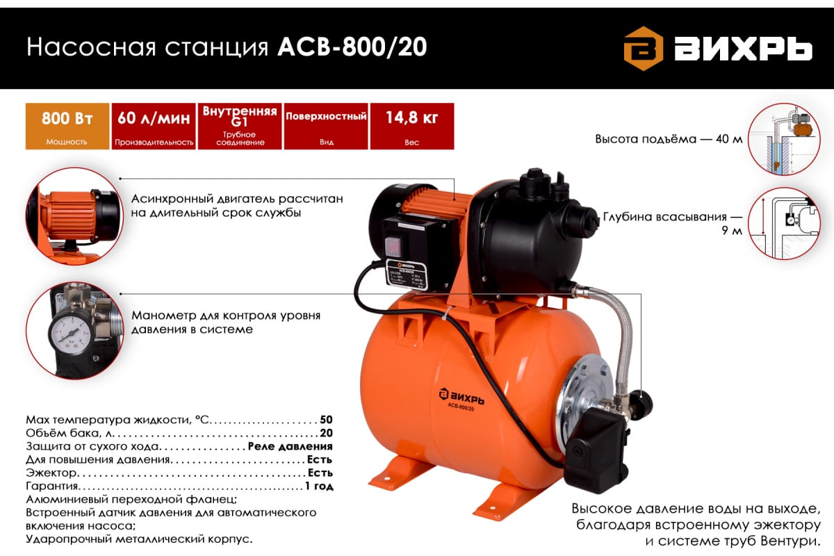Насосная станция "Вихрь" 60 л/мин 800 Вт АСВ-800/20 68/1/5