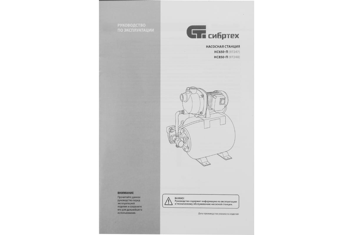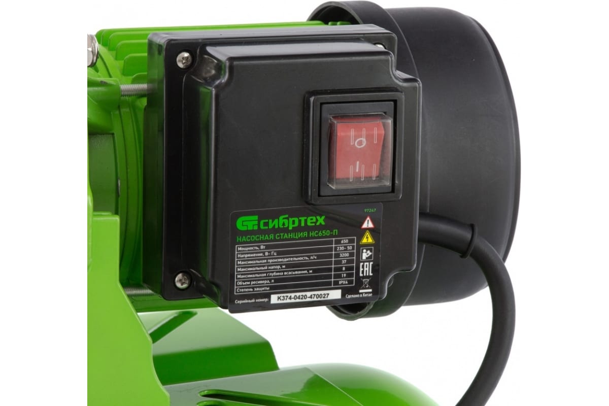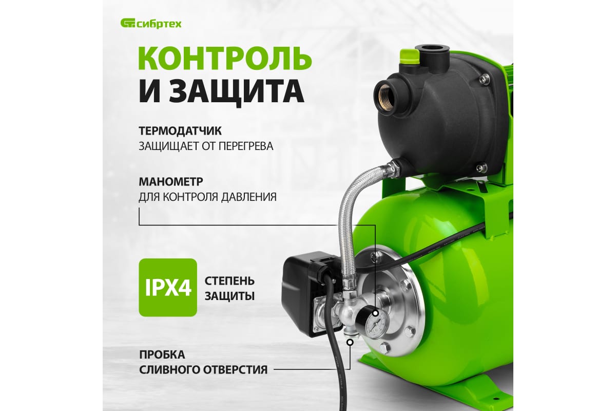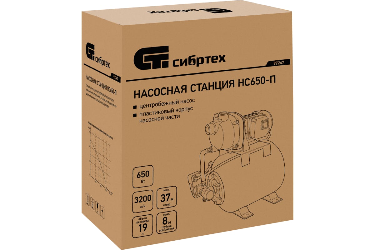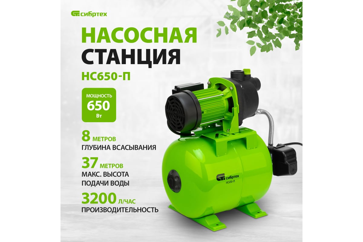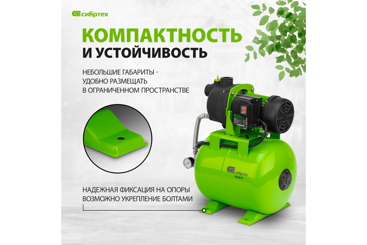 Насосная станция "Сибртех" 650 Вт, напор 37 м, 3200 л/ч, ресивер 19 л НС650-П арт. 97247