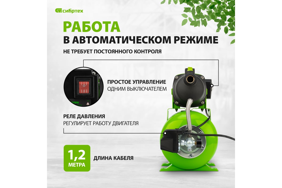 Насосная станция оснащена ресивером, поэтому двигатель включается только после израсходования накопленного запаса воды. Автоматизация рабочего процесса позволяет разумно потреблять как воду, так и электроэнергию.