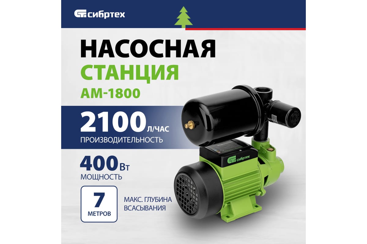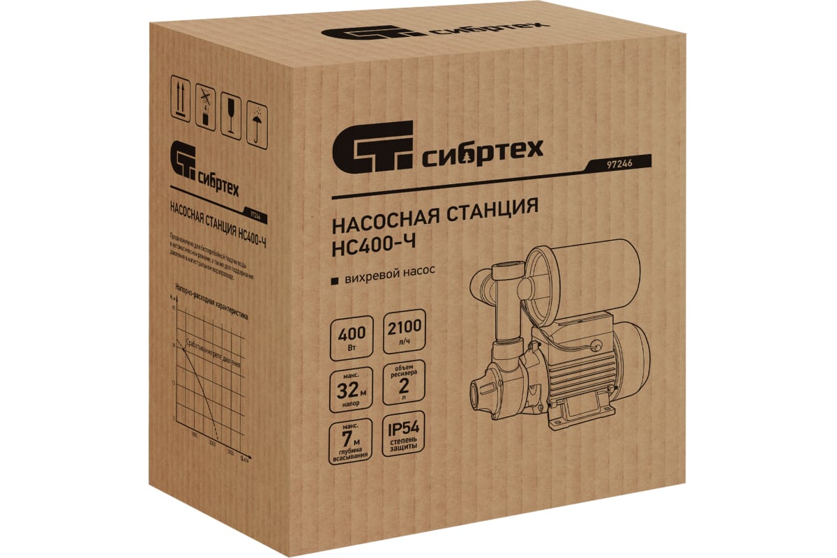 Насосная станция Сибртех НС400-Ч 97246 мощностью 400 Вт, с ресивером на 2 л, обеспечивает напор до 32 м и производительность до 2100 л/ч. Предназначена для бесперебойной подачи чистой воды с глубины до 7 м, позволяет организовать водоснабжение на дачном участке. Насосная станция поддерживает стабильное давление в напорной магистрали и оптимальна для создания системы полива.